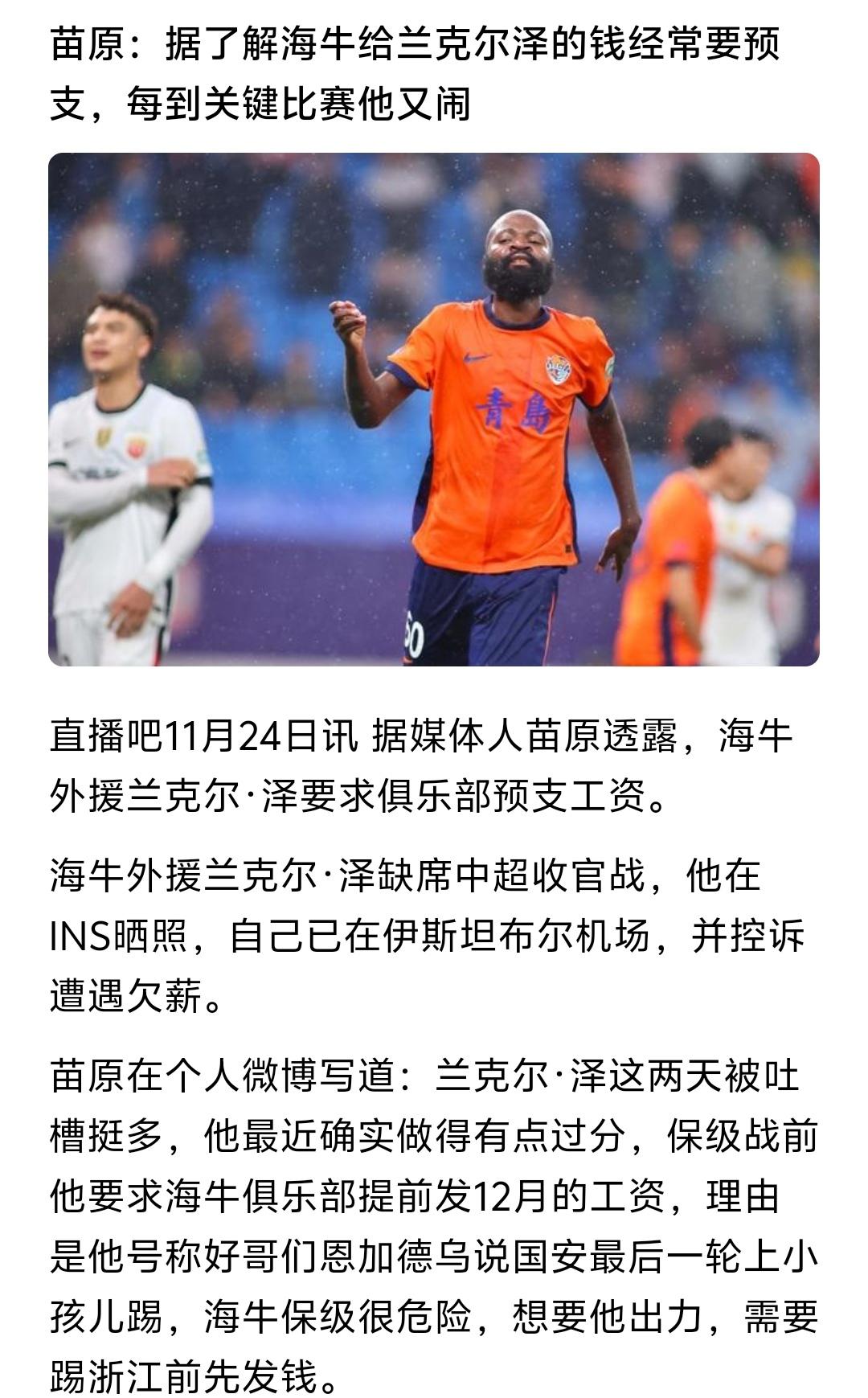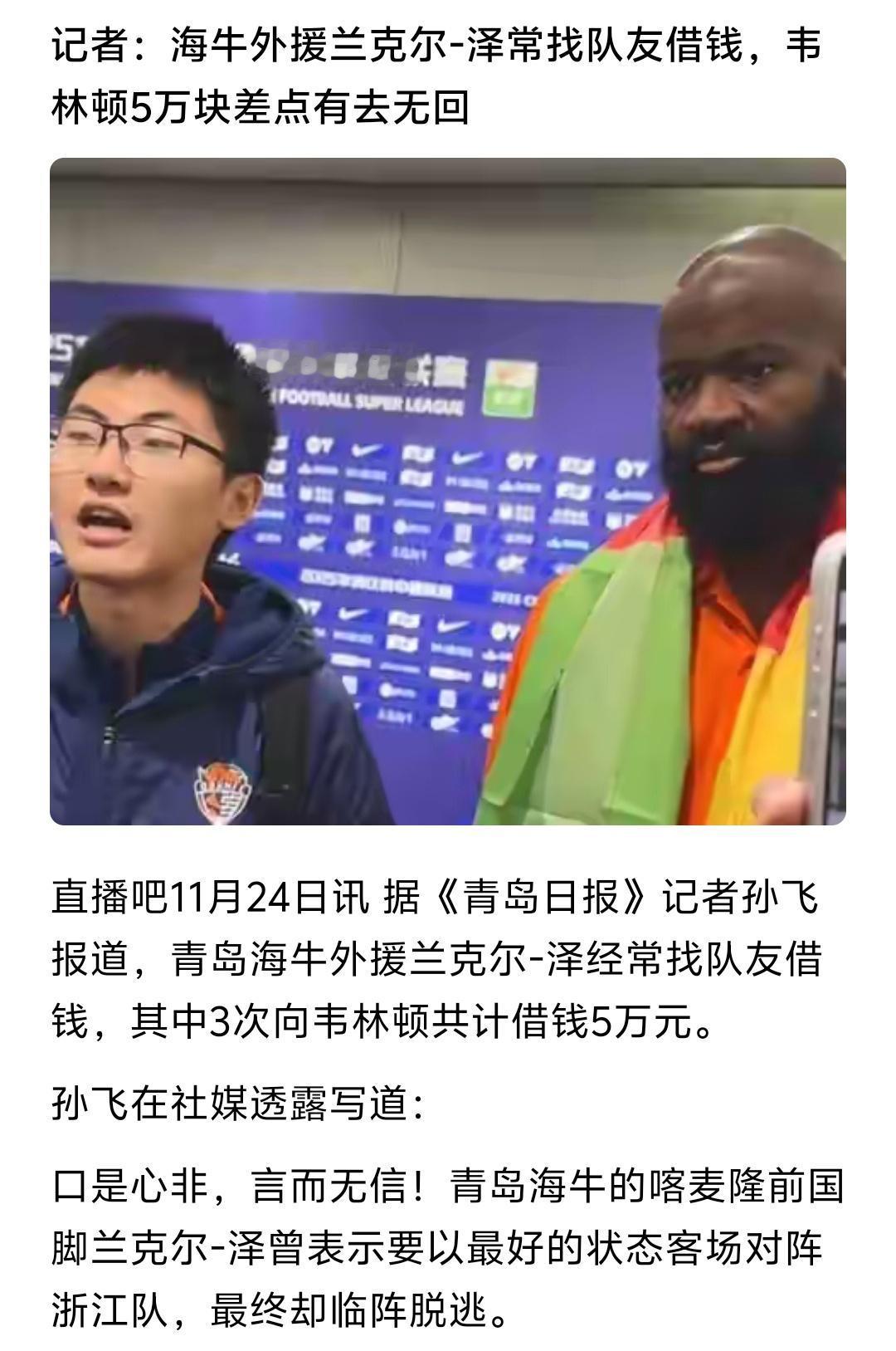 兰克尔泽空手套白狼要朴智洙秋衣占便宜;兰克尔泽常找队友借钱有的差点有去无回;兰克尔泽经常预支工资,关键比赛闹? 看到这一天多青岛海牛外援兰克尔泽的负面消息,真的会想,兰克尔泽真的这么渣么,怎么以前不说这几天因为薪水问题,这些问题都曝光出来了,不太理解!