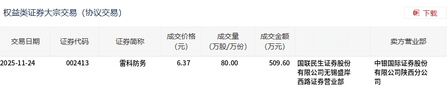 雷科防务今日大宗交易平价成交80万股,成交额509.6万元