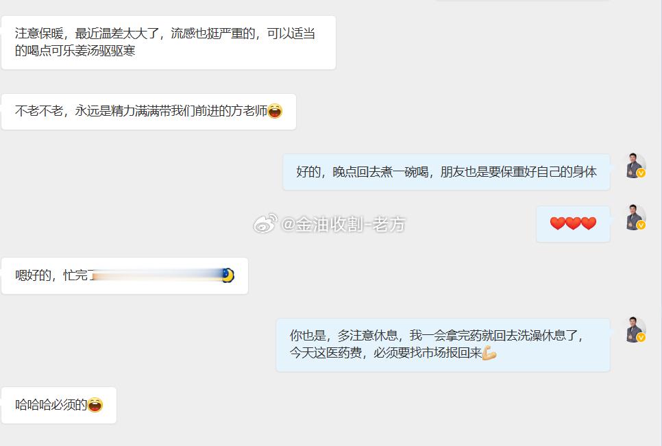 感谢粉丝朋友们对老方的关心,今天就先到这里了,我刚刚到家,准备洗个澡吃药休息了,