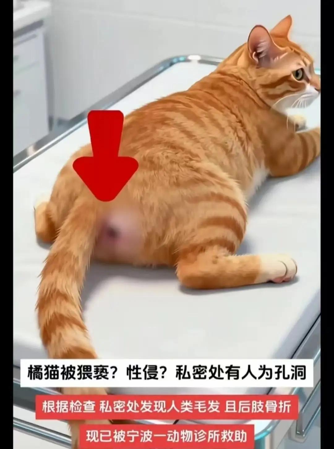 宁波这男的操作真的突破人性底线! 对一只毫无反抗力的橘猫下狠手,性侵还打断两条腿,监控里施暴的十几分钟,看得人浑身发冷、气得发抖! 救助站发现橘猫时,浑身是血直发抖,私处撕裂伤、腿骨断裂,医生说伤口是外力强行造成,还残留成年男性毛发。这哪是虐待,分明是泯灭人性的施暴!弱小的生命成了他发泄的工具,连对动物的基本怜悯心都没有,这样的人心里得有多扭曲? 别觉得虐猫只是“小事”,对弱势生命施暴的人,迟早可能把恶意转嫁到人类身上。纵容这种行为,就是给社会埋隐患。万幸橘猫被及时救助,但身体和心理的创伤可能伴随一生。 现在警方已经介入,可更该反思的是,怎么让这类施暴者付出应有的代价?你觉得该出台更严的约束机制吗?或者有什么办法能减少这类虐动物事件?