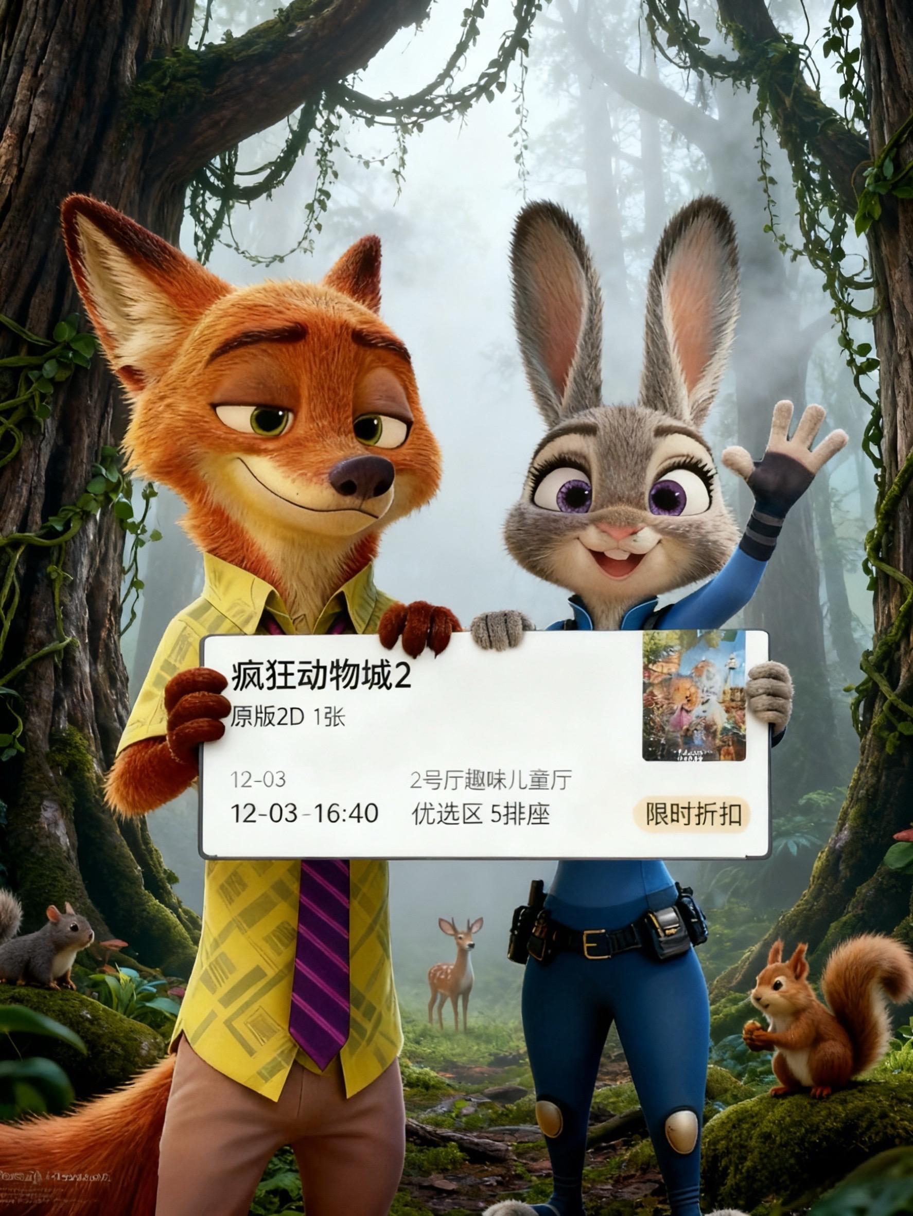 《疯狂动物城2》电影票手慢无!尼克朱迪拿着“冒险邀请函”等你,每一帧都像闯进童话森林,不管是带娃还是约朋友,这趟欢乐必须赶上!