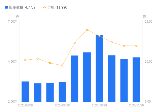 日期A股户数(户)流通A股户均持股数(股)户均持股市值(万元)2025-11-204773126271.4431.502025-11-104666626871.0032.272025-10-314900525588.4531.782025-10-206159820357.1926.972025-10-105082624671.6734.542025-09-304890625640.2531.722025-09-193218338963.5037.132025-09-103180139431.5338.762025-08-293155739736.4241.292025-08-203261538447.4139.18