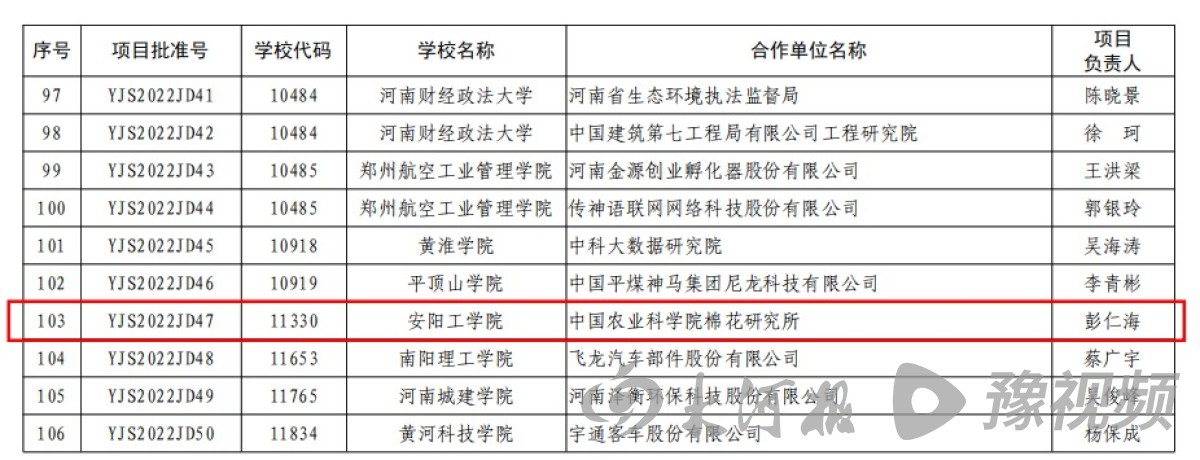 近日,河南省教育厅印发通知,由安阳工学院副院长彭仁海教授牵头建设的河南省研究生联合培养基地项目顺利通过终期验收,该项目由安阳工学院与中国农业科学院棉花研究所联合共建。