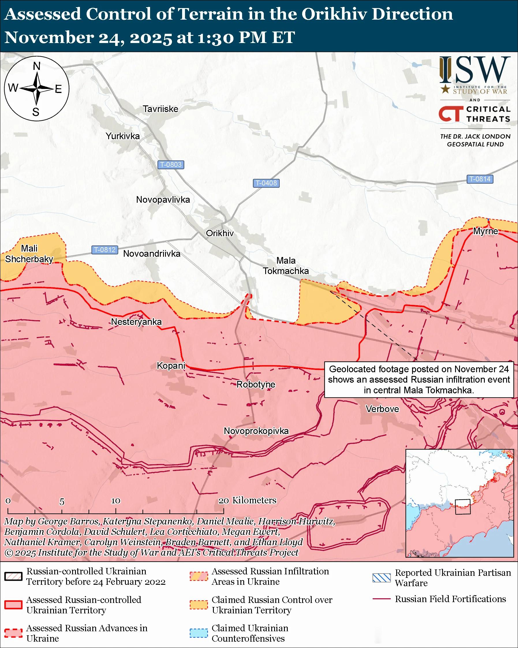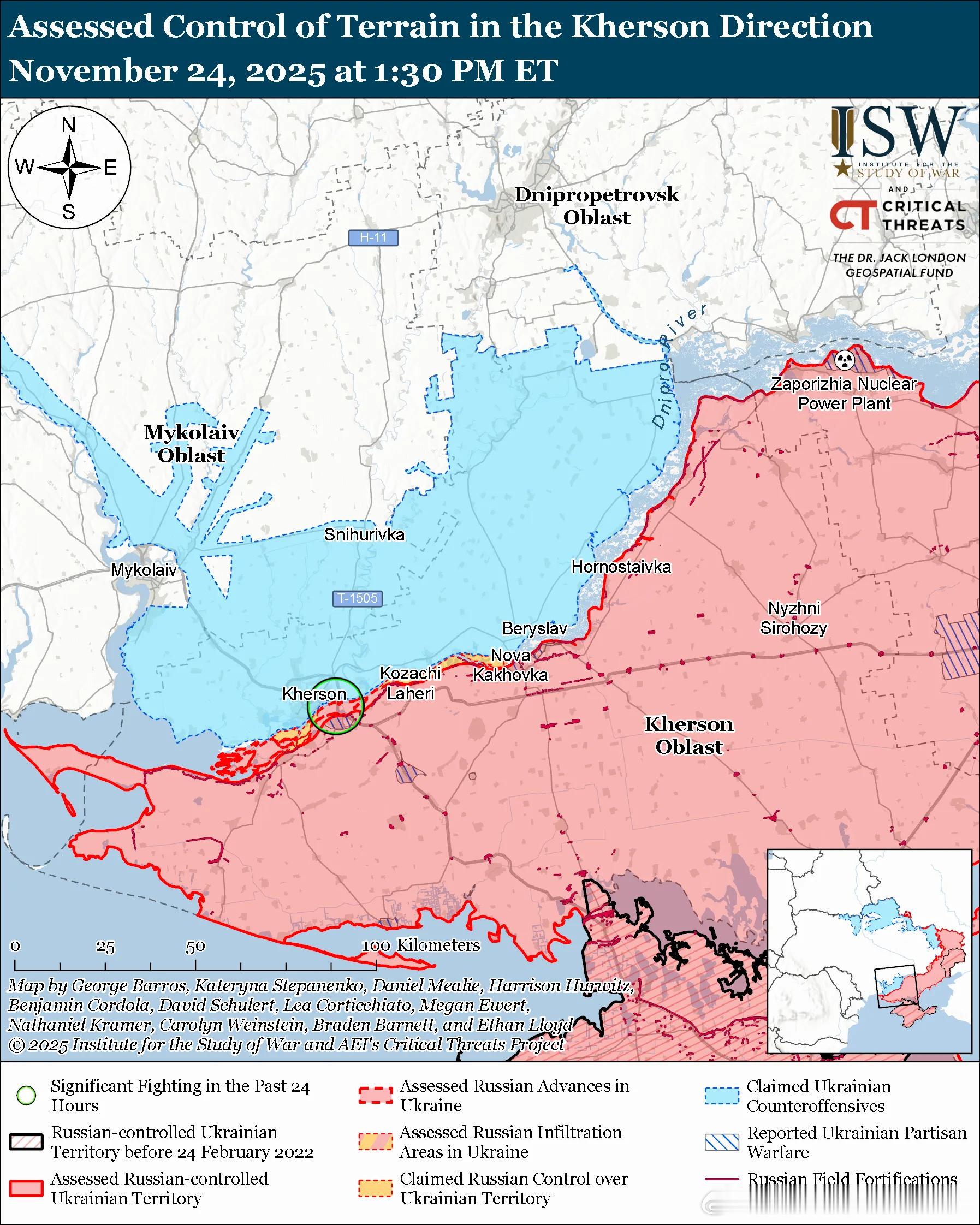 南方轴心俄军目标:守住前线阵地,确保后方免受乌克兰军队袭击,并推进至扎波罗热市的管式火炮射程之内。俄军最近向胡利亚波列方向推进。评估俄军进展:11 月 20 日一名乌克兰军方消息人士报告称,俄军已推进至沃夫恰河,这表明俄军可能已占领维德拉德内、克尔皮奇内、叶戈里夫卡、丹尼利夫卡、拉迪斯内和涅恰伊夫卡(均位于胡利亚伊波列以北)。俄军在胡利亚波尔附近发动袭击; Hulyaipole 以北,靠近 Yehorivka; Hulyaipole 东北部,靠近 Pryvilne、Pavlivka、Solodke、Dobropillya、Varvarivka、Pryluky 和 Krasnohirske;在 Hulyaipole 以东靠近 Zelenyi Hai、Vysoke 和 Zatyshshya 的地方。一位俄罗斯军事博主声称,乌克兰军队在胡利艾波尔、维德拉德内(胡利艾波尔以北)和多布罗皮利亚附近发动反击。作战序列:俄第30特种部队连(隶属第36集团军,东部军区)的无人机操作员正在多布罗皮利亚以西打击乌克兰的装备。第127摩步师(隶属第5集团军,东部军区)正在向多布罗皮利亚方向推进。第11集团军(隶属俄罗斯空天军和东部军区)正在胡利亚波列对乌克兰军队进行FAB制导滑翔炸弹袭击。第305炮兵旅(隶属第5集团军,东部军区)的无人机操作员正在胡利亚波列郊区打击乌克兰的装备。11月24日俄军继续在扎波罗热州西部发动进攻,但并未取得确切进展。评估俄军渗透:11 月 23 日发布的地理定位视频显示,乌克兰军队袭击了位于奥里希夫东南部的马拉托克马奇卡中心的一栋被俄军占领的建筑物。ISW 评估认为这是一次俄军渗透行动,但当时并未改变地形控制或战斗前沿 (FEBA)。未经证实的说法:一位俄罗斯军事博主声称,俄军占领了小托克马奇卡,并向小托克马奇卡以南和斯捷普诺戈尔斯克北部(奥里希夫以西)推进。一位与克里姆林宫有关联的军事博主声称,小托克马奇卡仍然是一个有争议的“灰色地带”。11月23日和24日,俄军进攻了奥里希夫东南部的马拉托克马奇卡;奥里希夫南部的新达尼利夫卡附近;奥里希夫西南部的新安德里夫卡附近;以及奥里希夫西部的普里莫尔斯克、斯捷波韦和斯捷普诺戈尔斯克附近。乌克兰军事情报总局局长基里洛·布达诺夫中将 11 月 24 日驳斥了有关俄军已逼近扎波罗热市的报道,但他指出,俄军正试图推进到该市的炮兵射程之内。乌克兰扎波罗热州军事管理局局长伊万·费多罗夫于 11 月 24 日报告称,俄军使用 (FPV) 无人机袭击了扎波罗热区韦谢良卡的一辆小巴,造成一名平民死亡。作战序列:据报道俄第7空降师(VDV)的无人机操作员继续在普里莫尔斯克袭击乌克兰军队。第4军事基地(第58集团军,南部军区)的无人机操作员正在奥里希夫以北袭击乌克兰装备。第291摩托化步兵团(第42摩步师,第58集团军)第3突击连的无人机操作员继续在奥里希夫附近袭击乌克兰装备。11月24日俄军继续向赫尔松方向发起进攻,但并未取得进展。11月23日和24日,俄军在赫尔松市以东的安东尼夫斯基公路桥附近发动进攻。一位俄罗斯军事博主声称,在赫尔松州活动的俄罗斯无人机操作员收到了新的无人机,并正在袭击乌克兰的车辆,包括公共汽车和轿车。该军事博主声称,俄军将把该地区行驶的所有车辆视为合法目标——无论国际法如何规定。该军事博主还声称,乌克兰军队控制了奥列什基(赫尔松市东南部)附近的俄军主要地面交通线(GLOC),包括O-221701奥列什基-皮什恰尼夫卡-皮德斯特普内公路、E-97奥列什基-萨赫-拉登斯克公路、P-57奥列什基-霍拉普里斯坦公路、新卡霍夫卡和卡霍夫卡(均位于赫尔松市东北部)、新兹布里夫卡和旧兹布里夫卡,以及金布恩沙嘴(均位于赫尔松市西南部),这严重阻碍了俄军的后勤补给。这位军事博主补充说,乌克兰无人机 15 分钟的盘旋时间有助于提高其有效性,而俄罗斯无人机前往金伯恩沙嘴的五次飞行中只有一次能够毫发无损地完成。战斗序列:据报道第 331 空降兵团(第 98 空降兵师)(据推测是无人机操作员)正在赫尔松方向袭击乌克兰车辆。