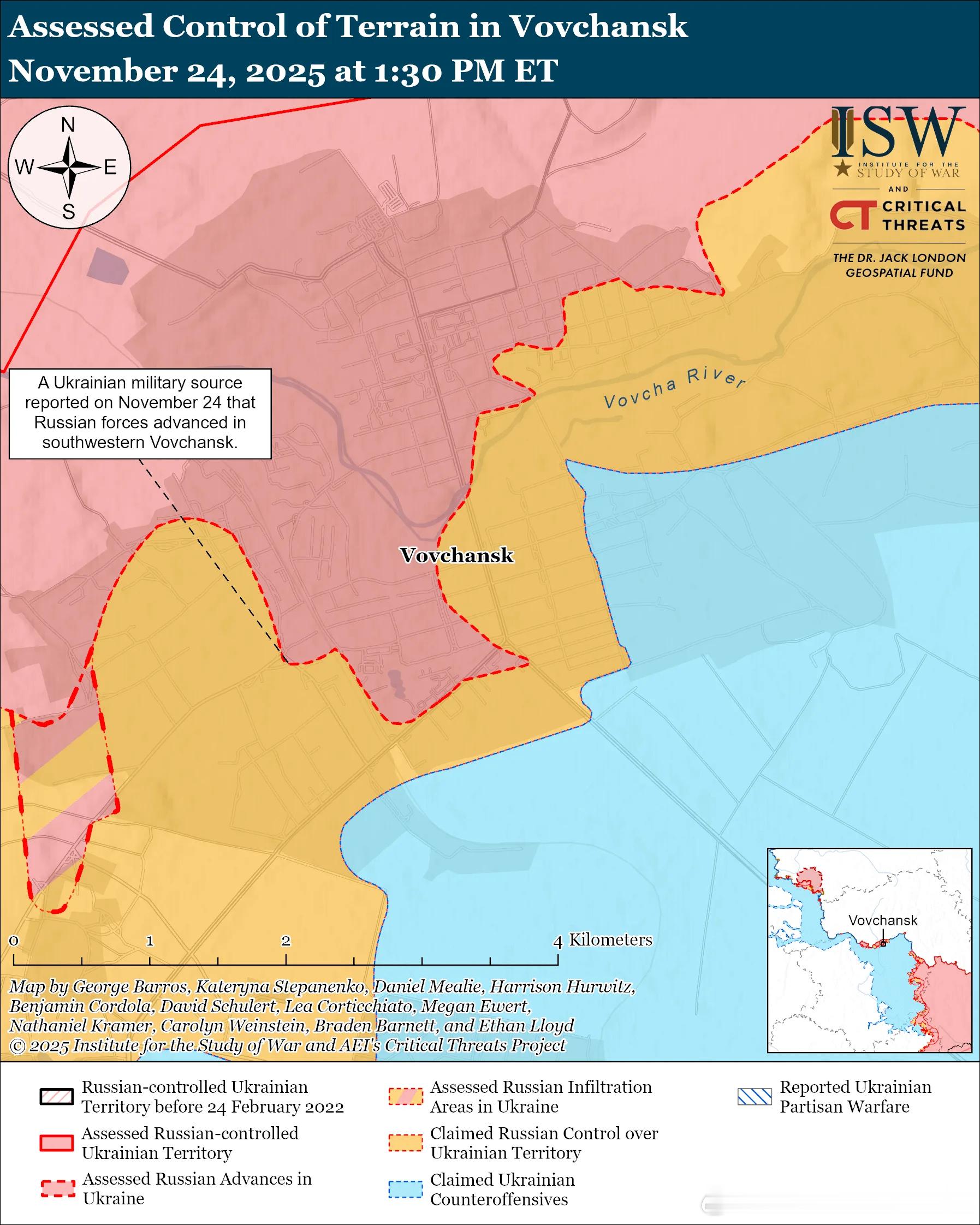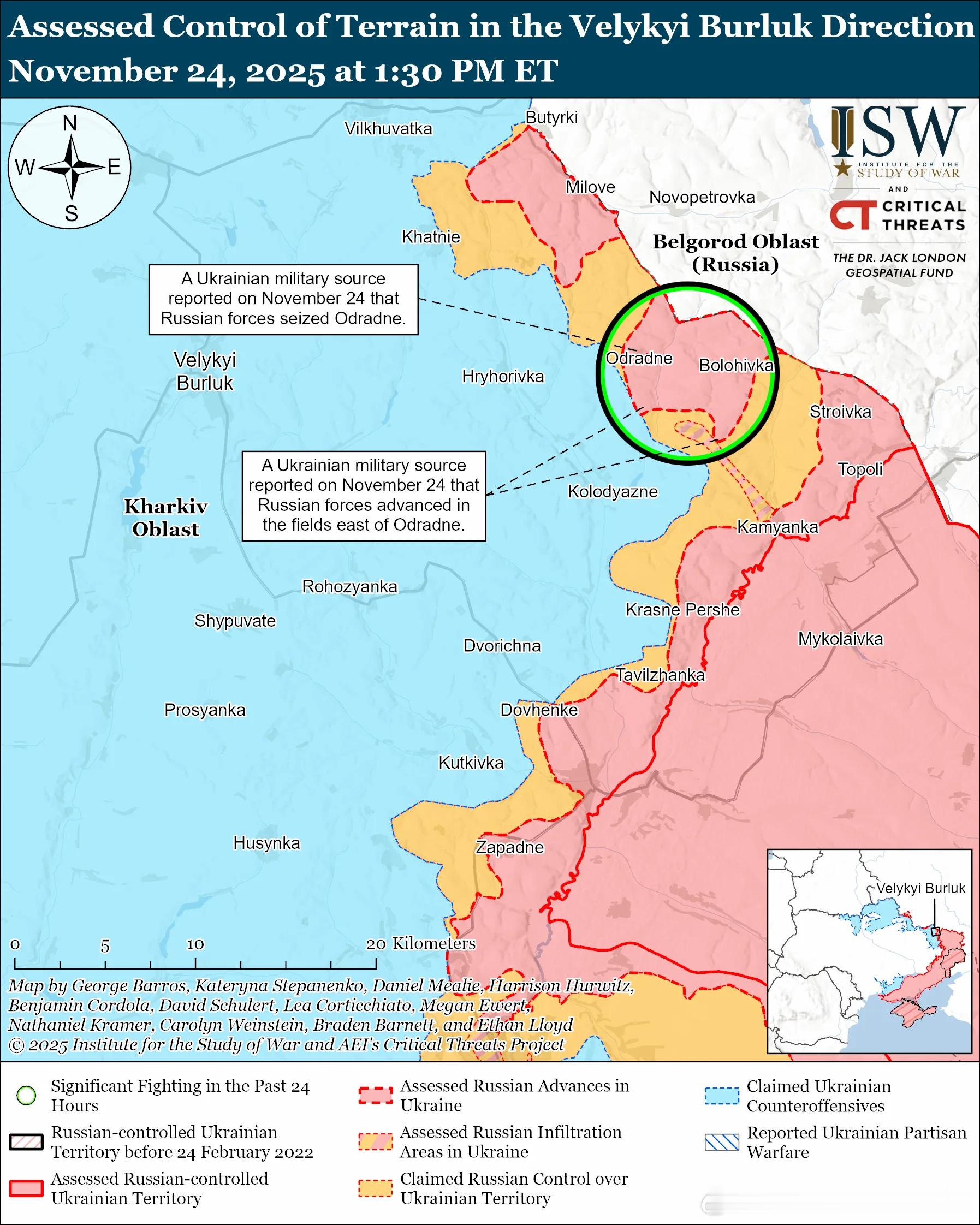 俄罗斯主要行动:乌克兰东部俄军主要行动1俄罗斯的目标:将乌克兰军队从与别尔哥罗德州接壤的国际边界击退,并使其进入哈尔科夫市的火炮射程之内。俄军最近向哈尔科夫市东北方向推进。评估俄军进展:乌克兰军事观察员马绍韦茨于 11 月 24 日报告称,俄军小股步兵部队推进至沃夫昌斯克西南部(哈尔科夫市东北部)的沃夫昌斯克公墓。11月23日和24日,俄军继续向哈尔科夫市东北部的沃夫昌斯克和锡涅尔尼科夫附近发动进攻。一名在沃夫昌斯克方向作战的乌军旅军官报告称,俄军正在沃夫昌斯克西郊发动进攻,并试图从沃夫昌斯克西郊以及锡涅尔尼科韦、采赫尔内和莱曼(均位于沃夫昌斯克以南)附近绕过该镇。该军官报告称,俄军正在使用火箭炮摧毁沃夫昌斯克北部,这很可能是为了使乌克兰军队难以守住该镇阵地。该军官还补充说,由于乌克兰军队对俄军地面交通线(GLOC)的火力控制,俄军不得不徒步而非乘坐车辆,耗时数日才能抵达前线。乌克兰军事观察员马绍韦茨于 11 月 24 日报告称,俄军可能打算通过绕过沃夫昌斯克西部森林地区的乌克兰防御工事,削弱沃夫昌斯克南部的乌克兰防御,并在该市西南部集结兵力发动进攻,并切断乌克兰通往斯塔里萨尔蒂夫和鲁比日内(均位于沃夫昌斯克西南部)的陆路交通线。作战序列:马绍韦茨报告称,俄第128摩步旅(第44军,列宁格勒军区)正在沃夫昌斯克南部作战。车臣西部-艾哈迈德营(据称隶属于南部军区)和库尔恰洛耶夫斯基区内务部正在沃夫昌斯克附近作战。第83摩步团(第69摩步师,第6集团军,列宁格勒军区)正在哈尔科夫方向作战。俄军最近向大布尔鲁克方向推进。对俄军进展的评估:马绍韦茨于11月24日报告称,俄军近期从博洛希夫卡(奥德拉德内东南部)推进至奥德拉德内(大布尔卢克以东),这表明俄军此前也占领了博洛希夫卡。马绍韦茨还报告称,俄军向奥德拉德内以东推进。一位俄罗斯军事博客作者也在11月24日声称俄军占领了奥德拉德内。11月23日和24日,俄军从韦利基布尔卢克东南方向向科洛迪亚兹涅发动进攻。马绍韦茨指出,负责大布尔卢克方向的第6集团军正集中于米洛韦-克拉斯内佩尔舍地区(大布尔卢克东北至东南方向)的进攻行动。马绍韦茨评估认为,俄军近期可能会加强向克拉斯内佩尔舍和新瓦西利夫卡(均位于大布尔卢克东南方向)的进攻行动,并可能加强安巴尔内(大布尔卢克东北方向)附近的进攻行动。马绍韦茨报告称,俄军已将第18摩步师(第11集团军)和第72摩步师(第44集团军)从沃夫昌斯克方向调往大布尔卢克方向。