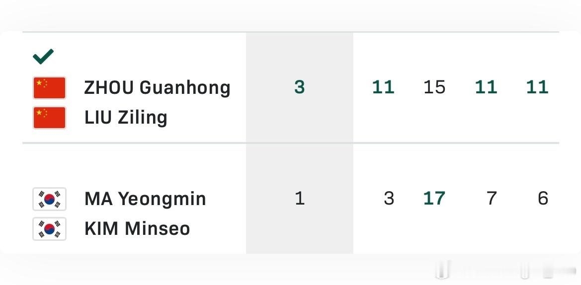 U15混双1/16决赛🇨🇳刘子菱/周冠宏3比1金珉舒/马渶旻🇰🇷(11-3,15-17,11-7,11-6)下一轮🆚阮芯诺/黎骐豪🇭🇰