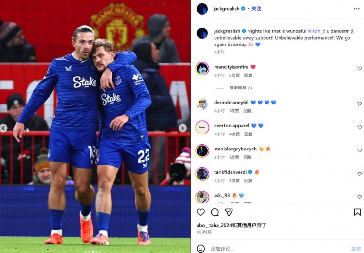 格拉利什也在赛后通过社媒晒出和进球功臣霍尔的合照,并配文:“这样的夜晚真是太棒了!@霍尔,你真是个舞者远征球迷们太棒了!难以置信的表现!!我们周六再战!”