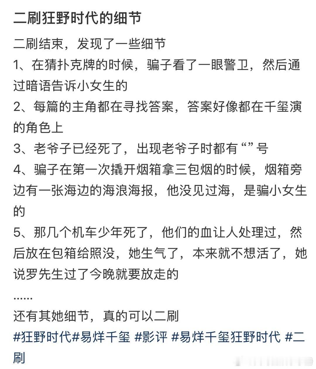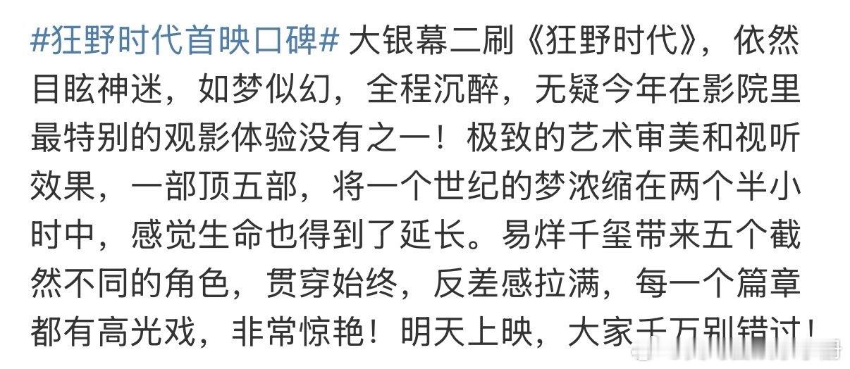 每个人看电影时的状态和体验都不一样,最终感受到的东西也不一样。每部电影都会有人爱,有人不爱,再正常不过的事情了。没必要单拎出一两个指标,轻率地评价一部电影的好坏,断章取义地误导观者。其实电影更应该综合各个方面来进行评价。不少看过《狂野时代》的观众,纷纷表示电影深刻而震撼,细节满满,值得二刷去深挖内涵。它属于那种越品越好味的电影。如果要关注影片数据,那不妨看看电影的二刷率?