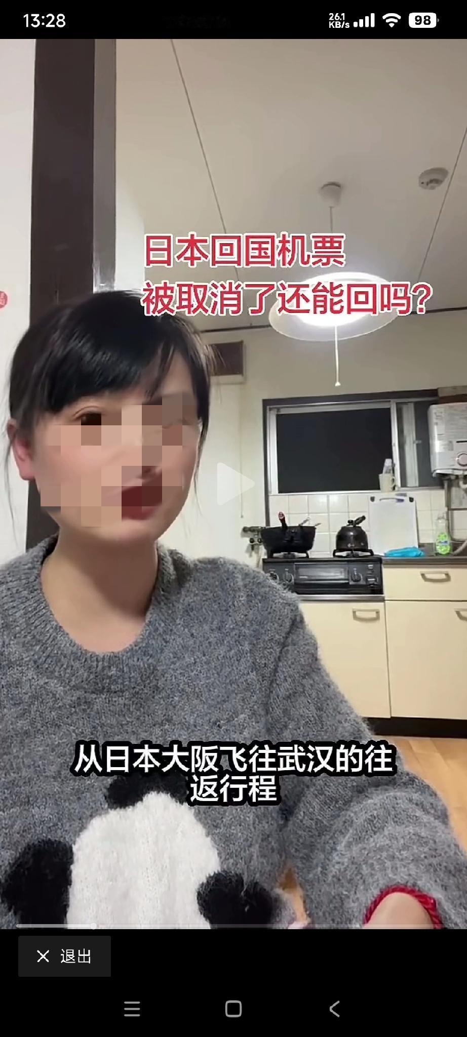“日本回国机票被取消了还能会吗?” 这位博主在日本工作,她说从大阪到武汉的往返机票被取消了,她担心回不了中国。 偶尔刷到过她的视频,她在日本打工一个月大概赚二十几万日元。 机票被取消了,她担心回不来,发视频跟网友分享这个事情。 有网友给她支招让她不需要担心回不来的问题。 网友告诉她有种东西叫中转机票,找个免签的国家中转一下,如泰国,新加坡等免签国家,以防有的机场需要先入关在办理中转值机,就可以顺利回来了! 缺点也有,就得多跑一些路,多花一些钱。 只要能顺利平安回家,一切辛苦花费都是值得的。