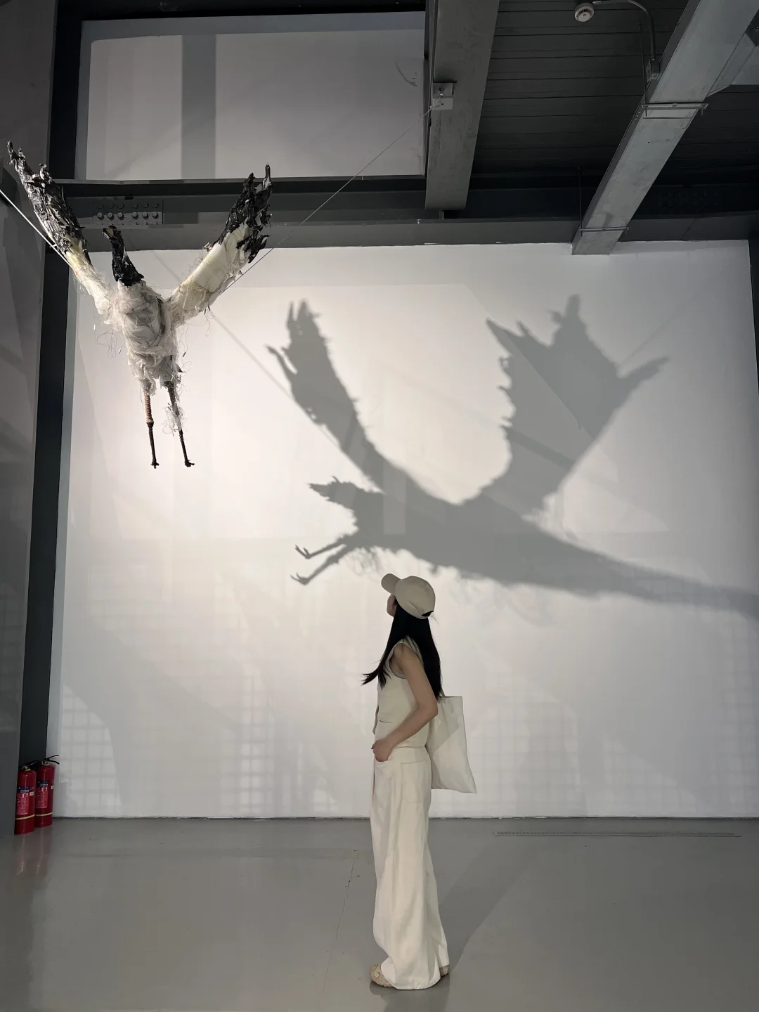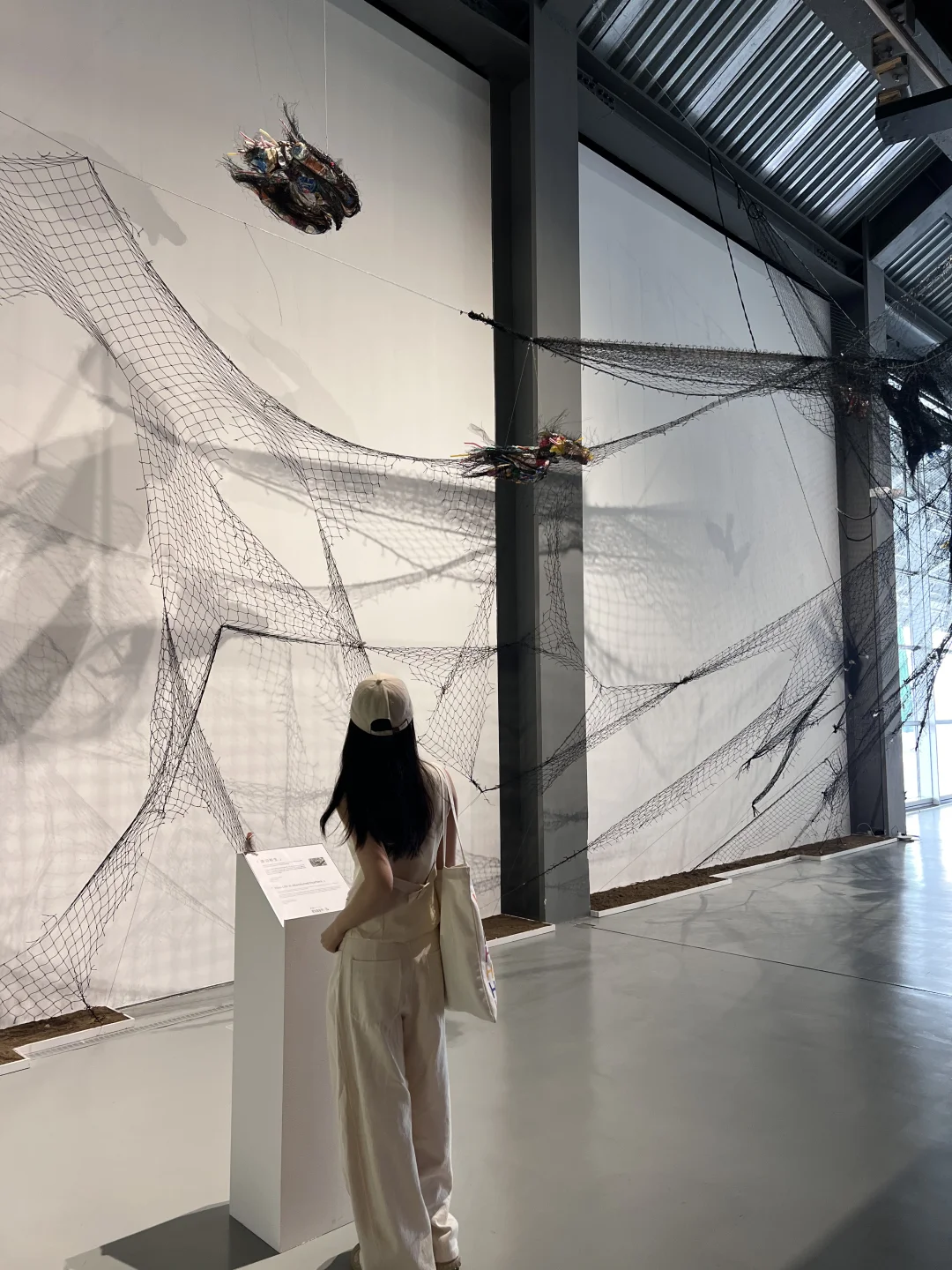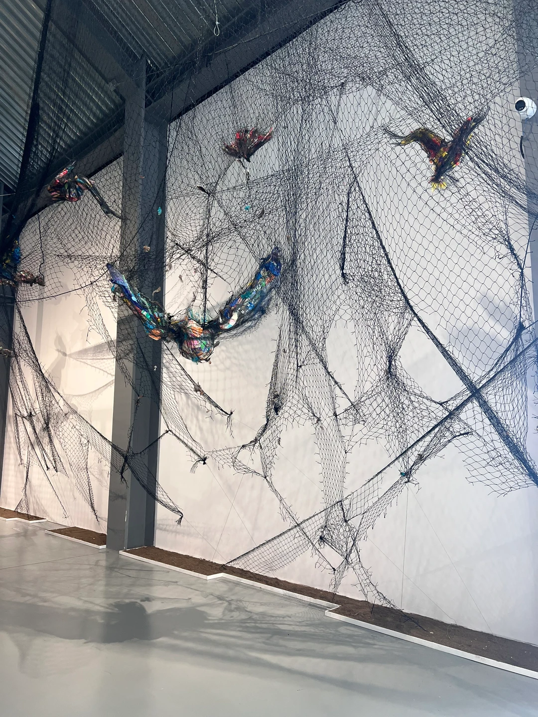 🔹旁边的作品《废羽新生》,以残破鸟网编织成鸟群受困的矩阵,让人触目难忘
