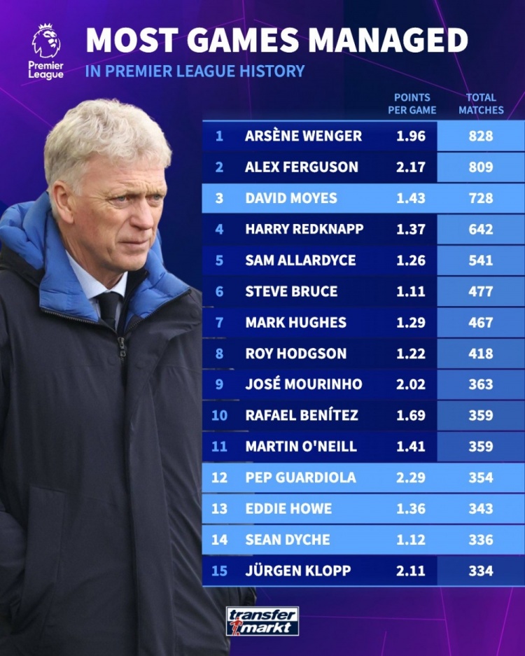 直播吧11月26日讯德国转会市场统计了英超主帅执教场次排名,莫耶斯728场排名第三,有望追赶弗格森和温格。