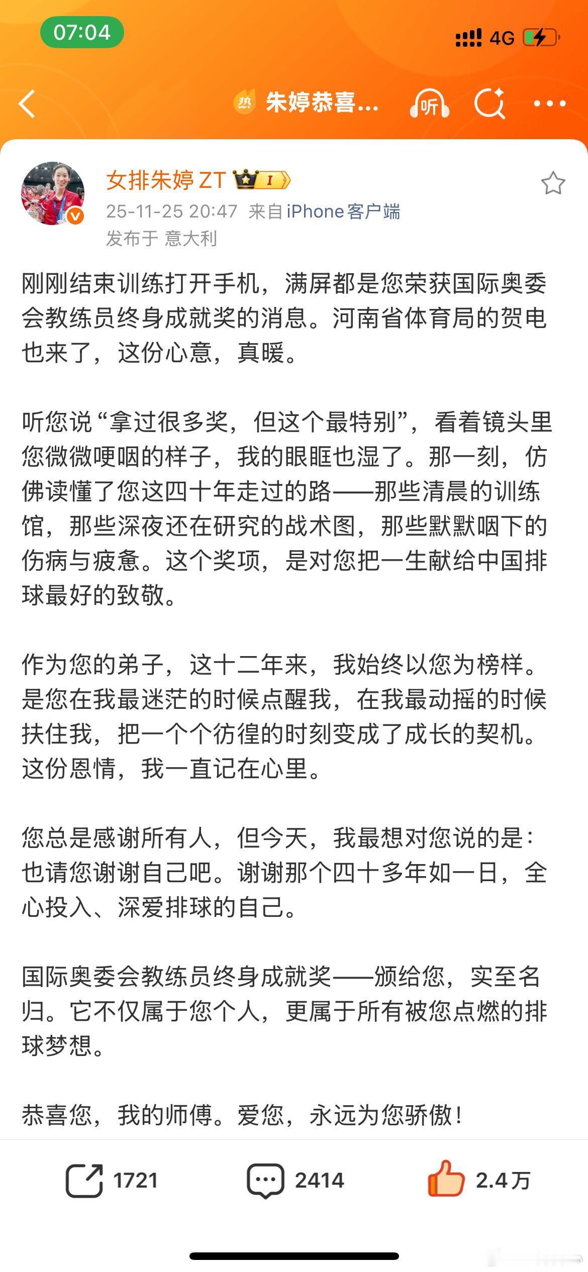朱婷在师傅郎平获得终身荣誉奖后发文【【刚刚结束训练打开手机,满屏都是您荣获国际奥委会教练员终身成就奖的消息。河南省体育局的贺电也来了,这份心意,真暖。听您说“拿过很多奖,但这个最特别”,看着镜头里您微微哽咽的样子,我的眼眶也湿了。那一刻,仿佛读懂了您这四十年走过的路——那些清晨的训练馆,那些深夜还在研究的战术图,那些默默咽下的伤病与疲惫。这个奖项,是对您把一生献给中国排球最好的致敬。作为您的弟子,这十二年来,我始终以您为榜样。是您在我最迷茫的时候点醒我,在我最动摇的时候扶住我,把一个个彷徨的时刻变成了成长的契机。这份恩情,我一直记在心里。您总是感谢所有人,但今天,我最想对您说的是:也请您谢谢自己吧。谢谢那个四十多年如一日,全心投入、深爱排球的自己。国际奥委会教练员终身成就奖——颁给您,实至名归。它不仅属于您个人,更属于所有被您点燃的排球梦想。恭喜您,我的师傅。爱您,永远为您骄傲!】】