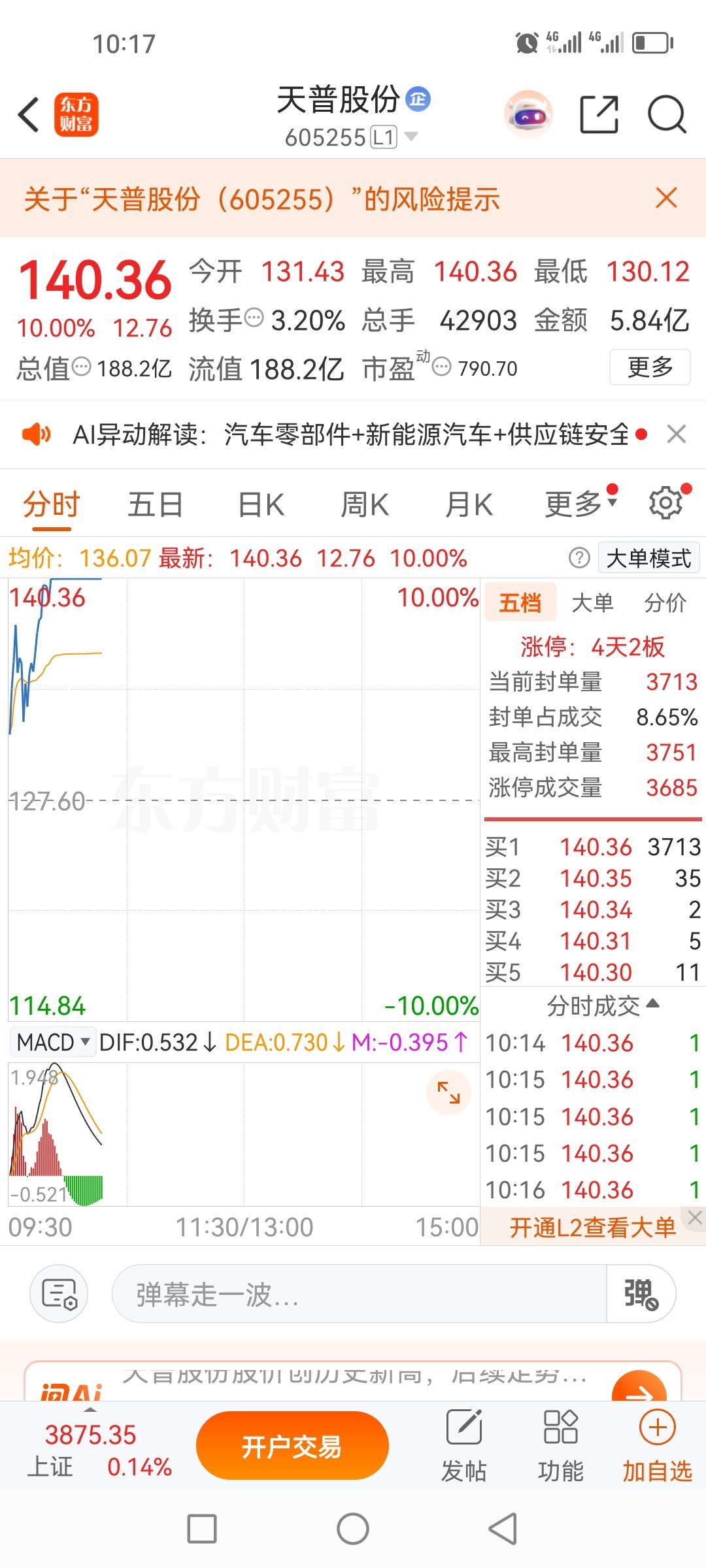 盘前分享的天普股份605255,今天又涨停了,太阳高照啊!
