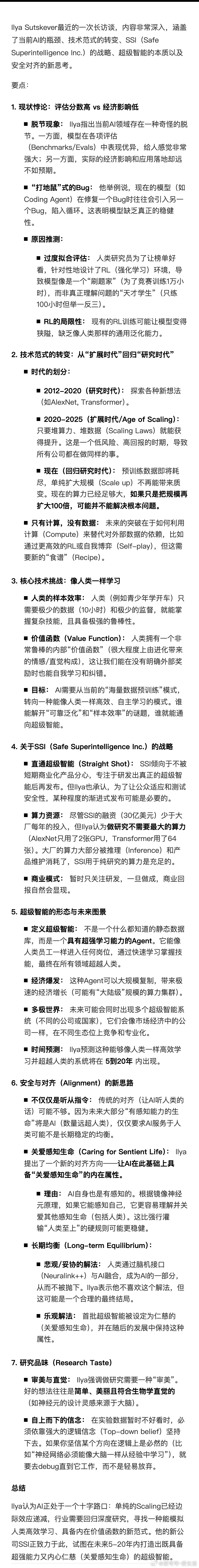 Ilya Sutskever(OpenAI联合创始人、前首席科学家,现Safe Superintelligence Inc. (SSI) CEO)2025年11月25日参加了Dwarkesh Patel主持的播客《Dwarkesh Podcast》第二期,这是他自离开OpenAI后首次公开长谈,焦点围绕AI发展范式转变、SSI战略及AGI安全。访谈时长约1小时,Sutskever分享了对行业“规模化时代”终结的观点,并强调回归基础研究的重要性。(要点详情见图二)