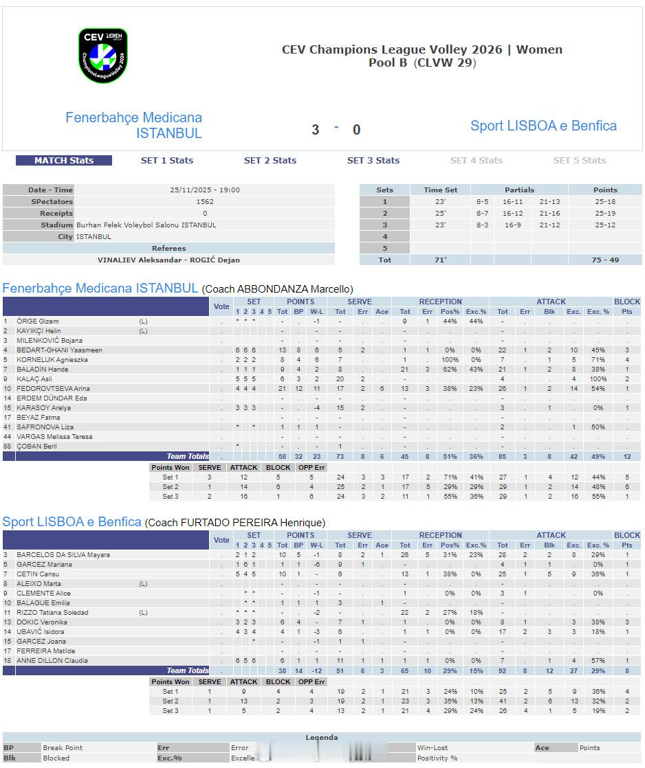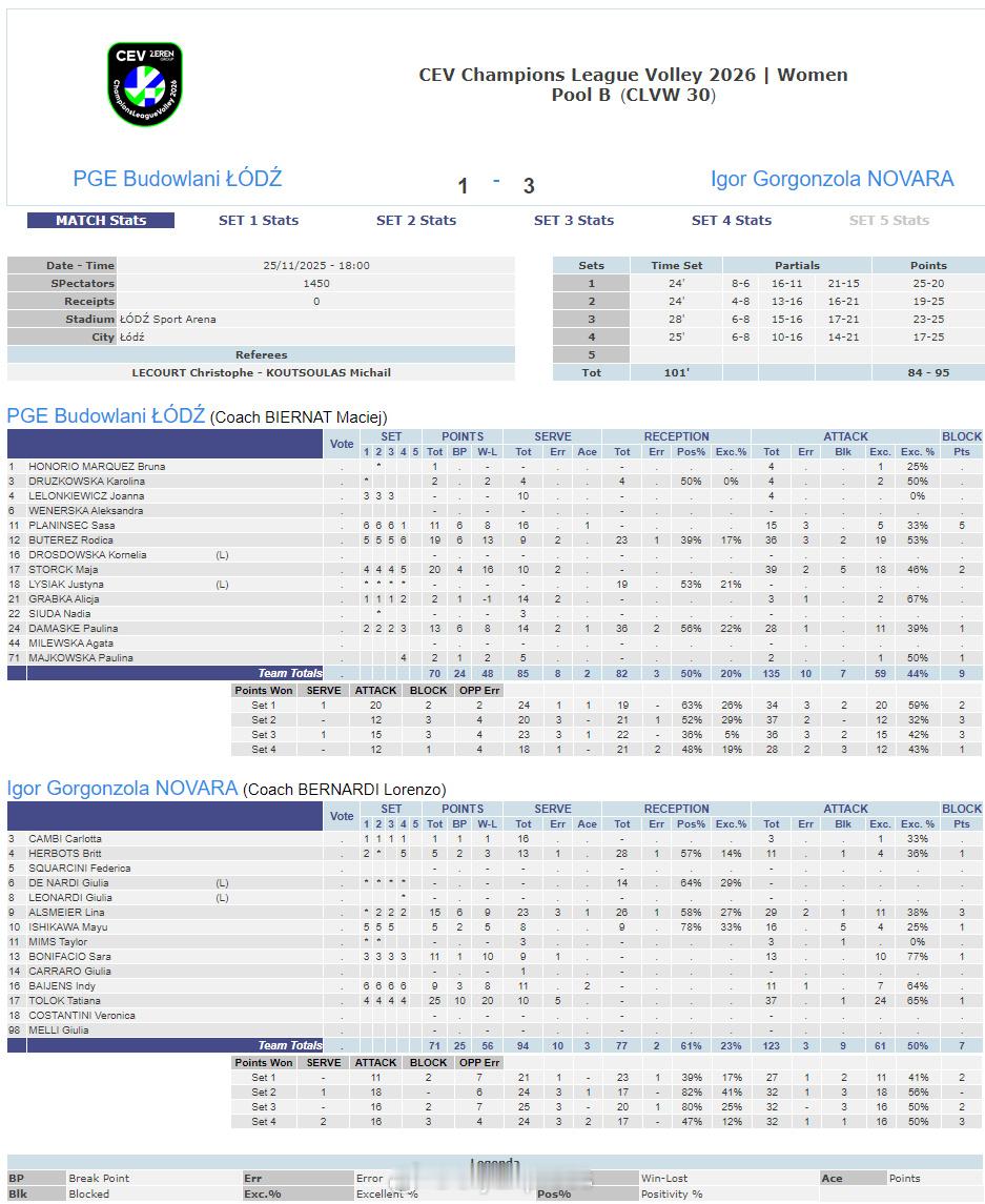 【欧冠女排诺瓦拉3-1罗兹建设 费内巴切轻取本菲卡】国际排坛战报速递 11月25日波兰罗兹,欧冠女排第四轮首回合,B组意大利诺瓦拉客场3-1(20-25/25-19/25-23/25-17)击败波兰罗兹建设。托洛克25分、MVP阿尔斯迈尔15分、博尼法西奥11分,斯托克20分、布特雷兹19分、普拉宁塞奇11分。土耳其费内巴切主场3-0(25-18/25-19/25-12)轻取葡萄牙本菲卡。MVP费多罗夫采娃21分、贝达特-加尼13分、巴尔加斯休战,巴塞罗斯-达席尔瓦和塞廷各10分。