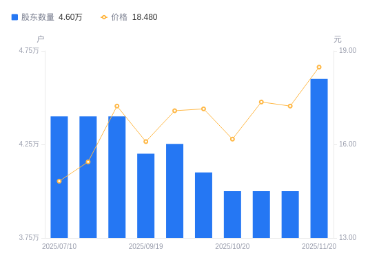 日期A股户数(户)流通A股户均持股数(股)户均持股市值(万元)2025-11-20460009532.1317.622025-11-104000010961.9418.892025-10-314000010961.9419.032025-10-204000010961.9417.732025-10-104100010694.5818.332025-09-304252610310.8217.612025-09-194200010439.9516.802025-09-10440009965.4017.172025-07-20440009965.4015.392025-07-10440009965.4014.77