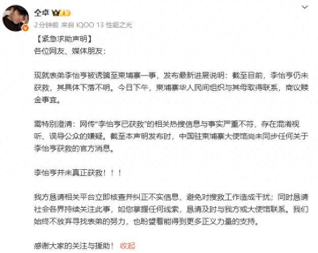 需特别澄清:网传“李怡亨已获救”的相关热搜信息与事实严重不符,存在混淆视听、误导公众的嫌疑。截至本声明发布时,中国驻柬埔寨大使馆尚未同步任何关于李怡亨获救的官方消息。