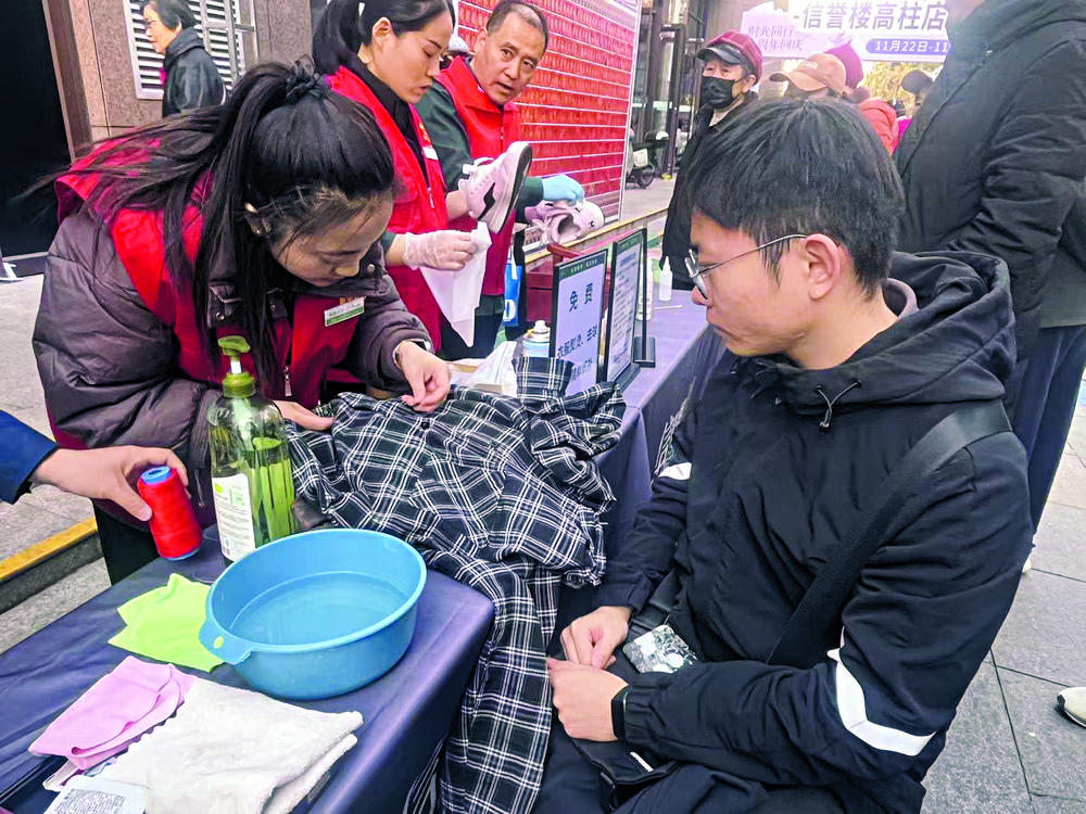 11月23日9时许,活动现场人头攒动、秩序井然,20多名志愿者身着志愿红成为广场上亮眼的风景线。广大志愿者在现场设置了生活服务、健康守护等区域,涵盖20余项便民服务小项目,可精准对接不同年龄阶段的居民需求。在免费理发、染发的摊位上,志愿者理发师手法麻利,根据居民的年龄和喜好修剪发型、调配发色。75岁的张大爷高兴地对记者说:“我在家门口就能享受到志愿者提供的义务理发服务,真的很暖心,为志愿者们的暖心行动点赞。”与此同时,在义务磨剪刀的摊位旁,居民排起了长队。只见,志愿者手握砂轮认真打磨每一把钝刀,在飞溅的火花中,原本锈迹斑斑、刃口迟钝的刀具逐渐变得锋利如新。60多岁的王女士拿着磨好的刀具连连称赞道:“街道和志愿者想得很周到,这些生活小事,都替我们解决了!”另一边,负责眼镜清洗、首饰整形缠线的志愿者耐心细致地把眼镜擦得锃亮,把变形的首饰修复整齐。像修眉、画眉,手机清理,皮鞋、小白鞋打理维修,衣物织补、熨烫等服务也深受居民欢迎,志愿者们用专业技能,轻松解决了居民生活中的小麻烦。更贴心的是,现场还提供耳穴贴敷、肩颈推拿、口腔健康筛查等健康服务,医护志愿者一对一问诊检查,还向居民分享养生小知识,让居民在享受便利的同时,收获健康保障。