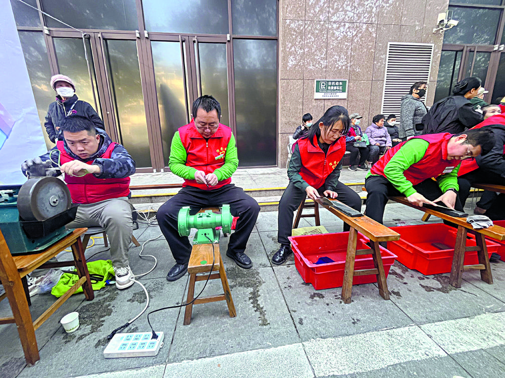 志愿者正在为居民磨刀具。首席记者刘琛敏摄