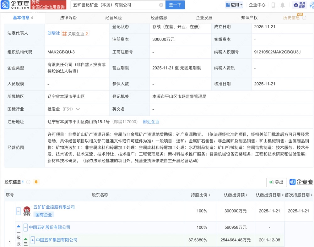 企查查APP显示,近日,五矿世纪矿业(本溪)有限公司成立,法定代表人为刘增社,注册资本30亿人民币,经营范围含非煤矿山矿产资源开采、金属与非金属矿产资源地质勘探、矿产资源勘查等。企查查股权穿透显示,该公司由中国五矿集团旗下五矿矿业控股有限公司全资持股。