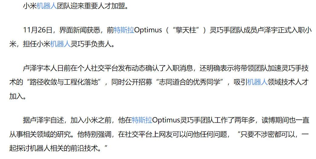 除了回购秀肌肉,小米今天还迎来了“技术大牛”加盟,前特斯啦Optimus(“擎天柱”)灵巧手团队成员卢泽宇正式入职小米,担任小米机器人灵巧手负责人。