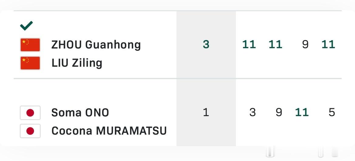 2025年国际乒联世青赛 U15混双1/4决赛🇨🇳刘子菱/周冠宏3比1村松心菜/大野飒真🇯🇵(11:3,11:9,9:11,11:5)