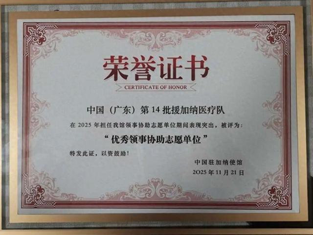 2025年11月21日,中国驻加纳使馆向中国(广东)第14批援加纳医疗队颁发“优秀领事协助志愿单位”荣誉证书,表彰该队在2025年度领事保护工作中作出的重要贡献。