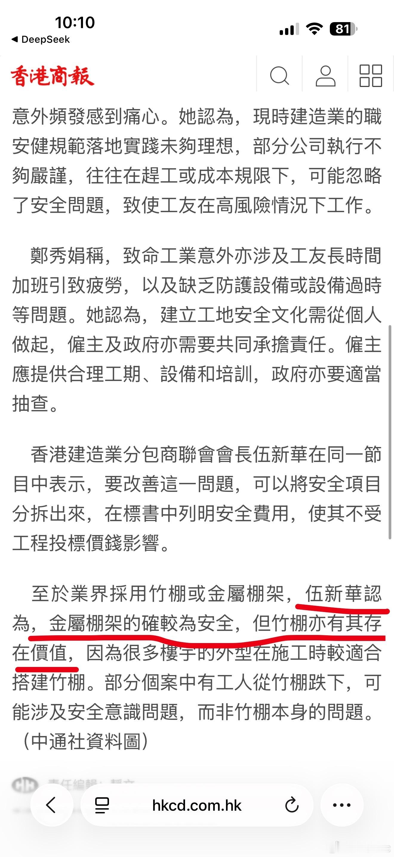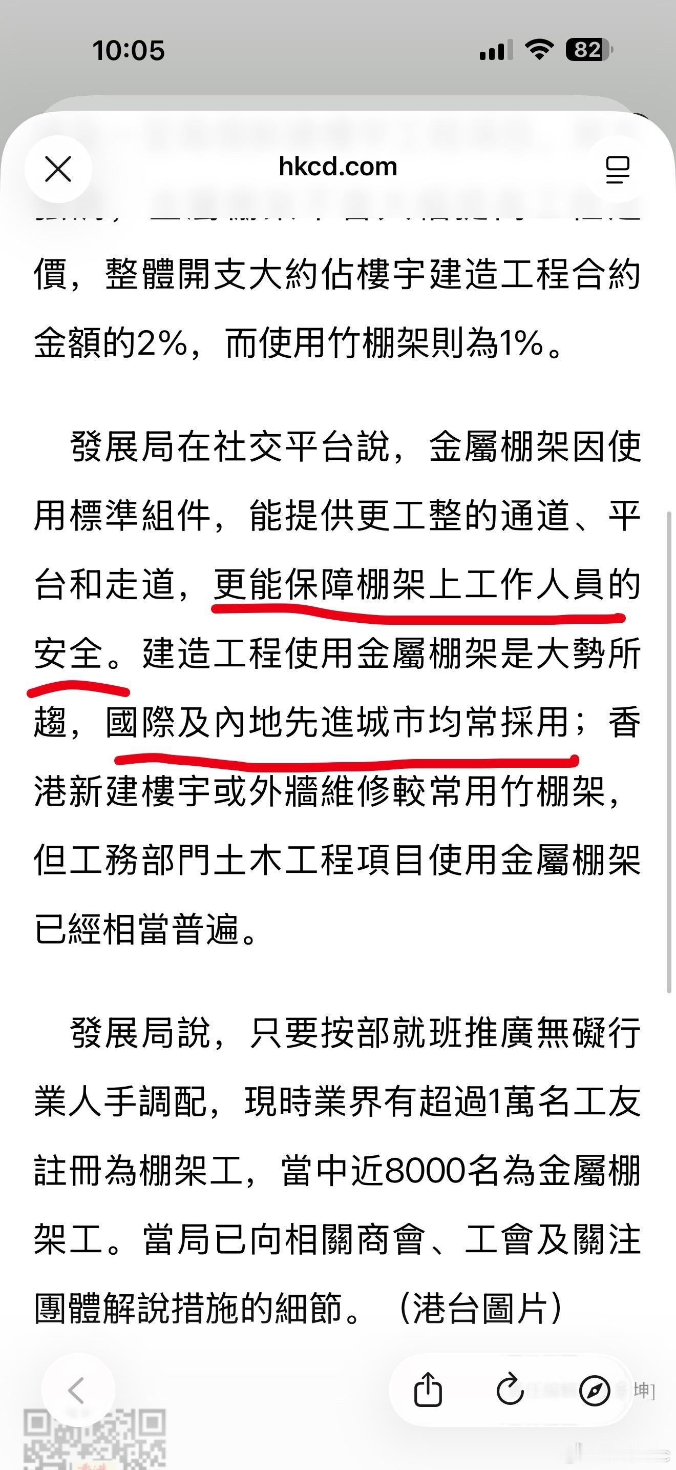 震惊于香港建筑用的脚手架(那边叫棚架)竟然还在使用竹子搭建,我们这村里搞个外装都用金属脚手架了,金属钢管锁扣搭建都是标准件,效率高,安全性高到不知道哪里去了…为此特意看了一下香港媒体的报道,在今年三月份就在呼吁要用金属棚架,当然成本会高出1%(图一),但是更安全…因为就在近一年就发生数起倒塌,坠亡,火灾…真的就是那一句改革有阵痛,不改革就是长痛。香港火灾