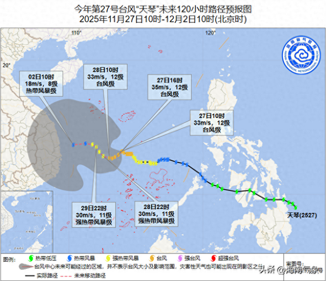 海南省气象局2025年11月27日10时50分继续发布台风四级预警(海上):今年第27号台风“天琴”已于27日02时加强为台风级,10时其中心位于北纬13.2度、东经113.9度,也就是距离海南省三沙市永兴岛南偏东方向约440公里的南海海面上,中心最大风力12级(33米/秒),七级风圈半径160-220公里,十级风圈半径60-80公里。