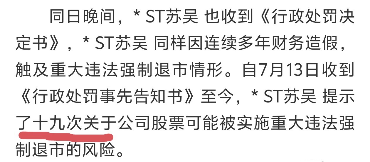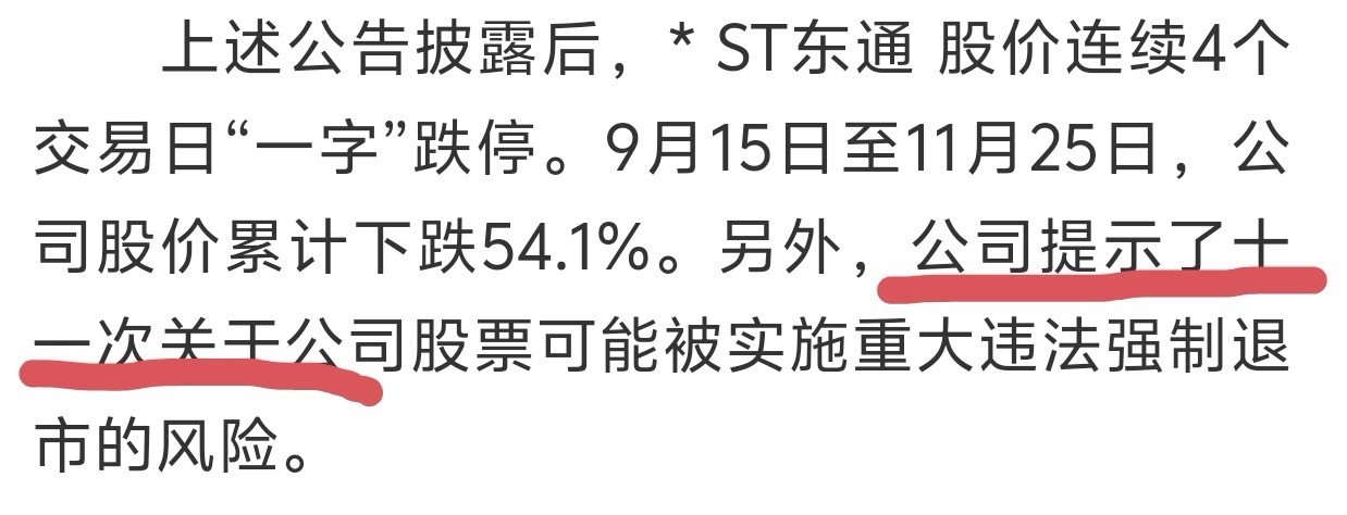 你们能想象为了诱多,z能有多疯狂吗? 11月25日有两家ST公司同时因为重大违法强制退市。他们是ST苏吴和ST东通!为了诱多可以说他们无所不用其极,在被退市前,ST苏吴连续5个涨停,st东通累计涨幅高达60%!停牌前一个交易日更是从跌停大涨7.86%,有网友当天抄底获得25%的涨幅。但是这一切都是套路,随着昨天的停牌,再次复牌之后,这两个个股都将进入退市整理期,老股民应该都知道,退市整理期一般都得80%以上的跌幅。可以说追涨近期的这些韭菜都是欲哭无泪。而且在此之前,ST苏吴已经连续十九次提示退市风险,ST东通连续十一次提示退市风险,仍然有韭菜埋头往上冲,一点风险意识都没有,甚至买之前可能看都没看风险提示,最主要的,在提示退市风险之后买入的这些韭菜就算以后退市也没有索赔的权力,只能自认倒霉。我要说,这些愣头青,不,不是愣头青,他们就是赌徒,亏了也是活该。但是还是提醒各位网友粉丝,一定要谨慎追涨,不要贪得无厌,吃大亏。