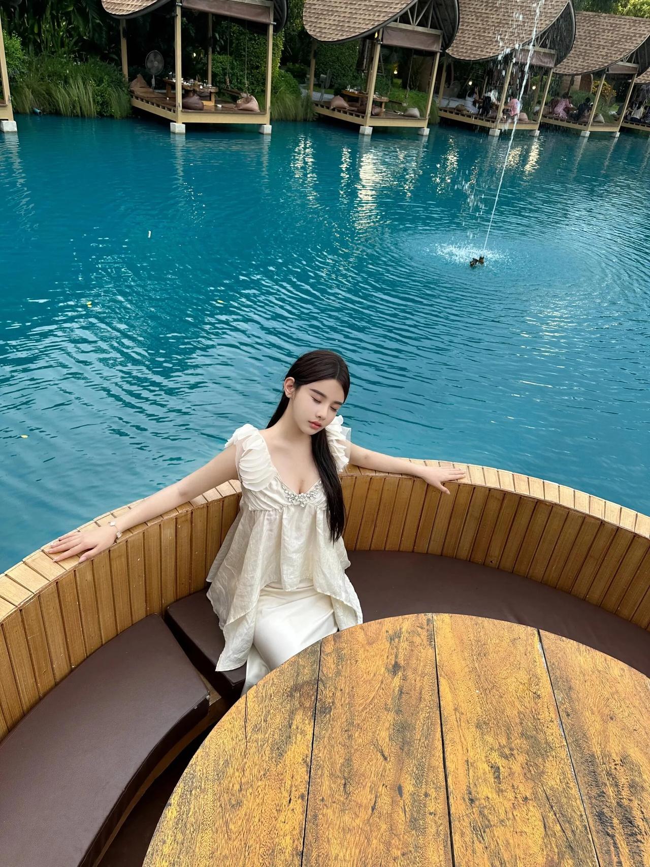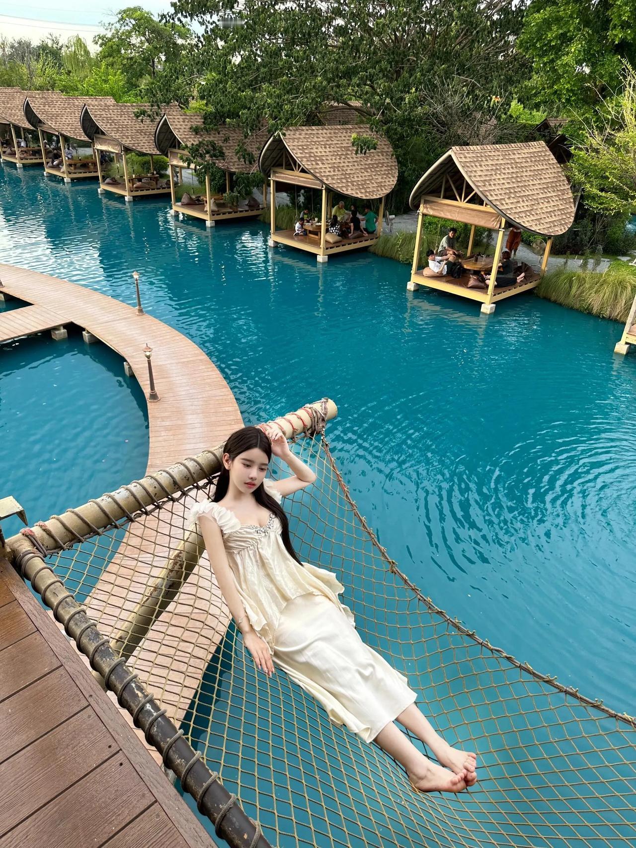 碧波荡漾水清浅,美女倚栏笑嫣然。