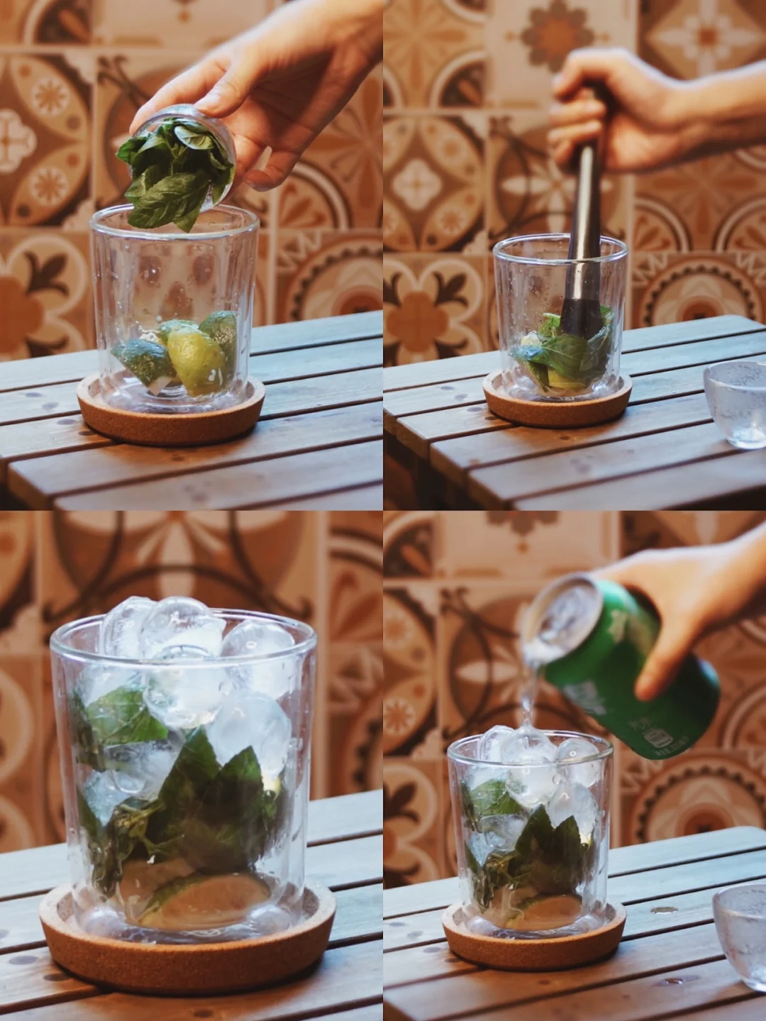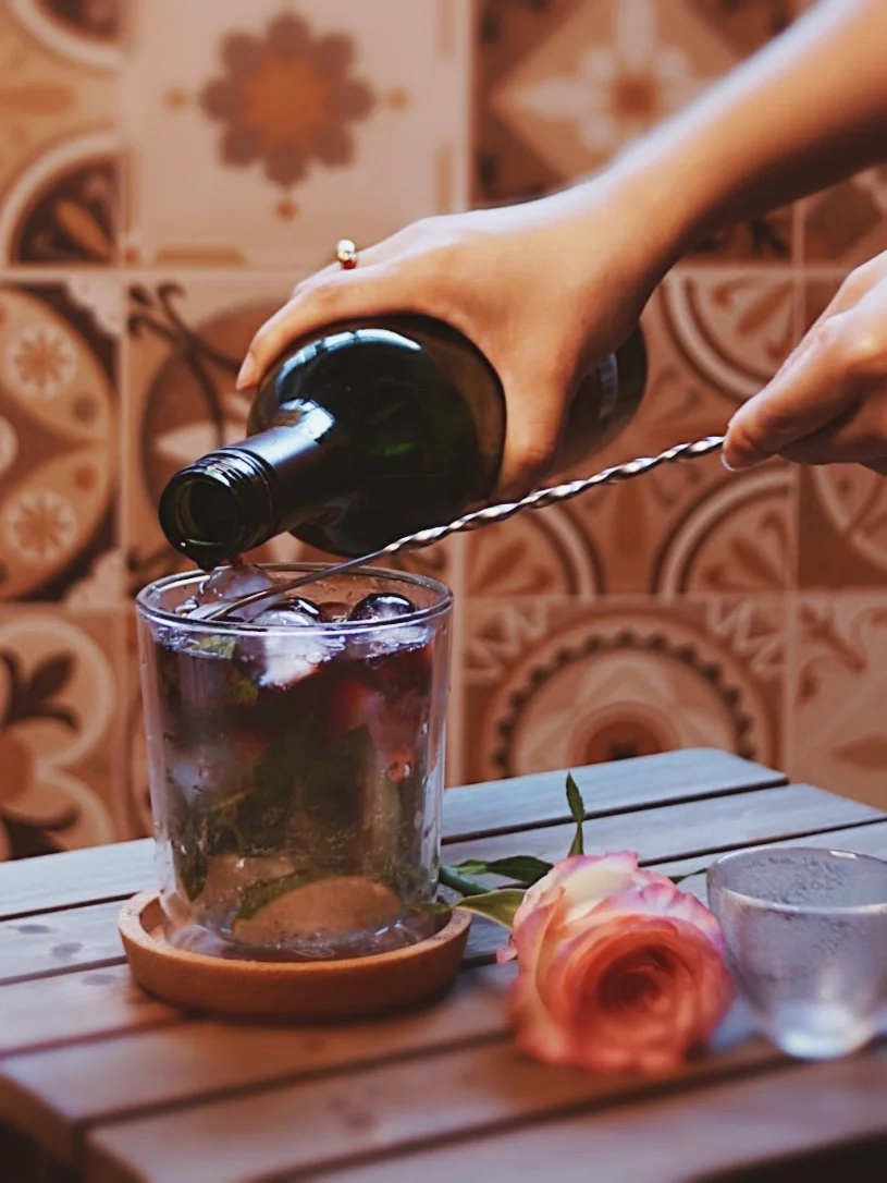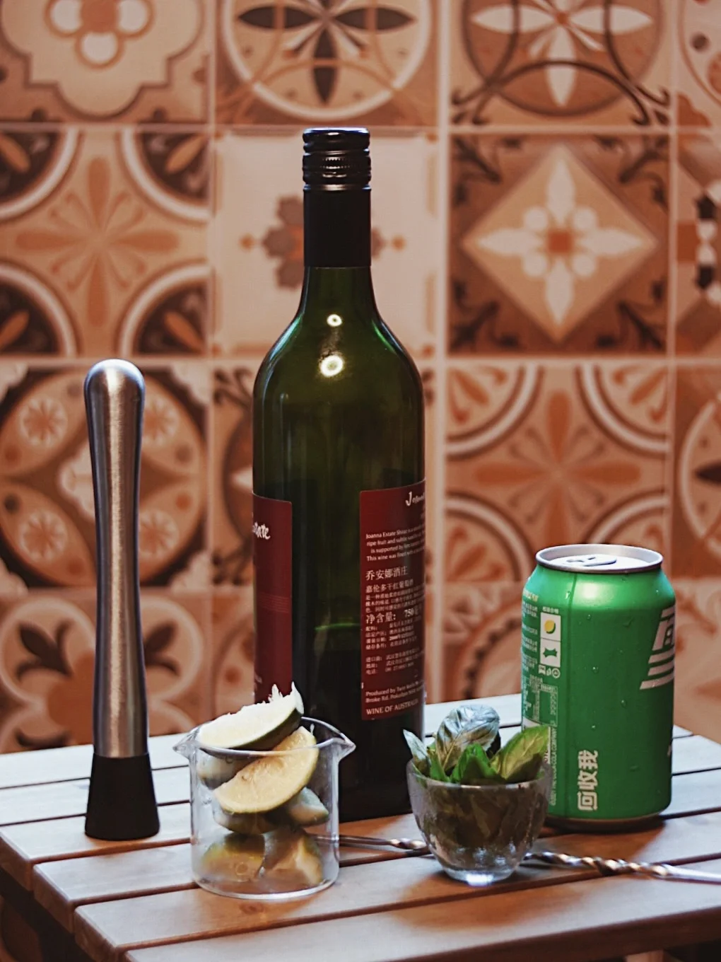 是热爱,是满足 是一阵温柔的晚风🍃 是轻松自如的相处 每当夜幕降临,酒精就是唯一的魔法 微醺的状态承载了释放繁杂情绪的出口 红酒不仅可以直饮,也可以与清凉的薄荷叶与青柠檬搭配 · ©️杯中放入切角的青柠檬和薄荷叶,捣出汁水 ©️冰块放置8分满,倒入雪碧至7分满 ©️红酒沿着吧勺缓慢倒入 · 🥂我特别离不开酒精,也很难想象没有酒精的日子该是多么枯燥无味 🥂因为我是用的雪碧,所以没有加砂糖;如果是气泡水,就需要加15g的砂糖,与薄荷叶和青柠檬一起捣出汁