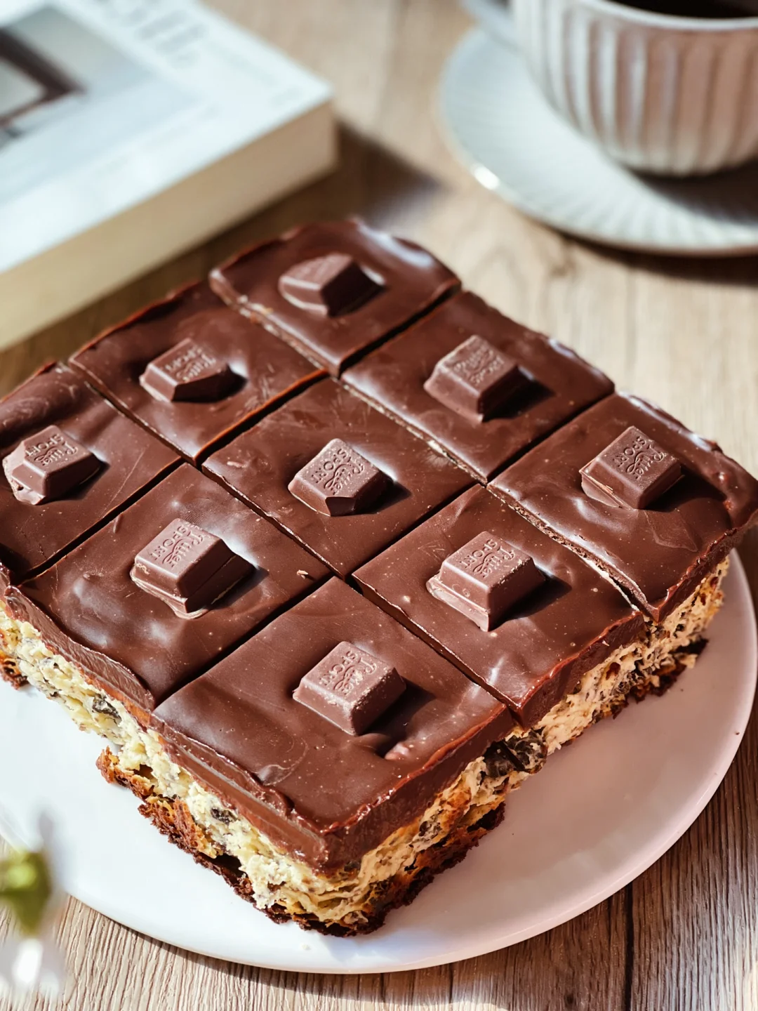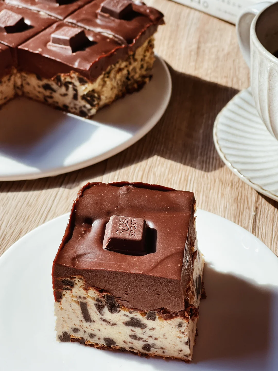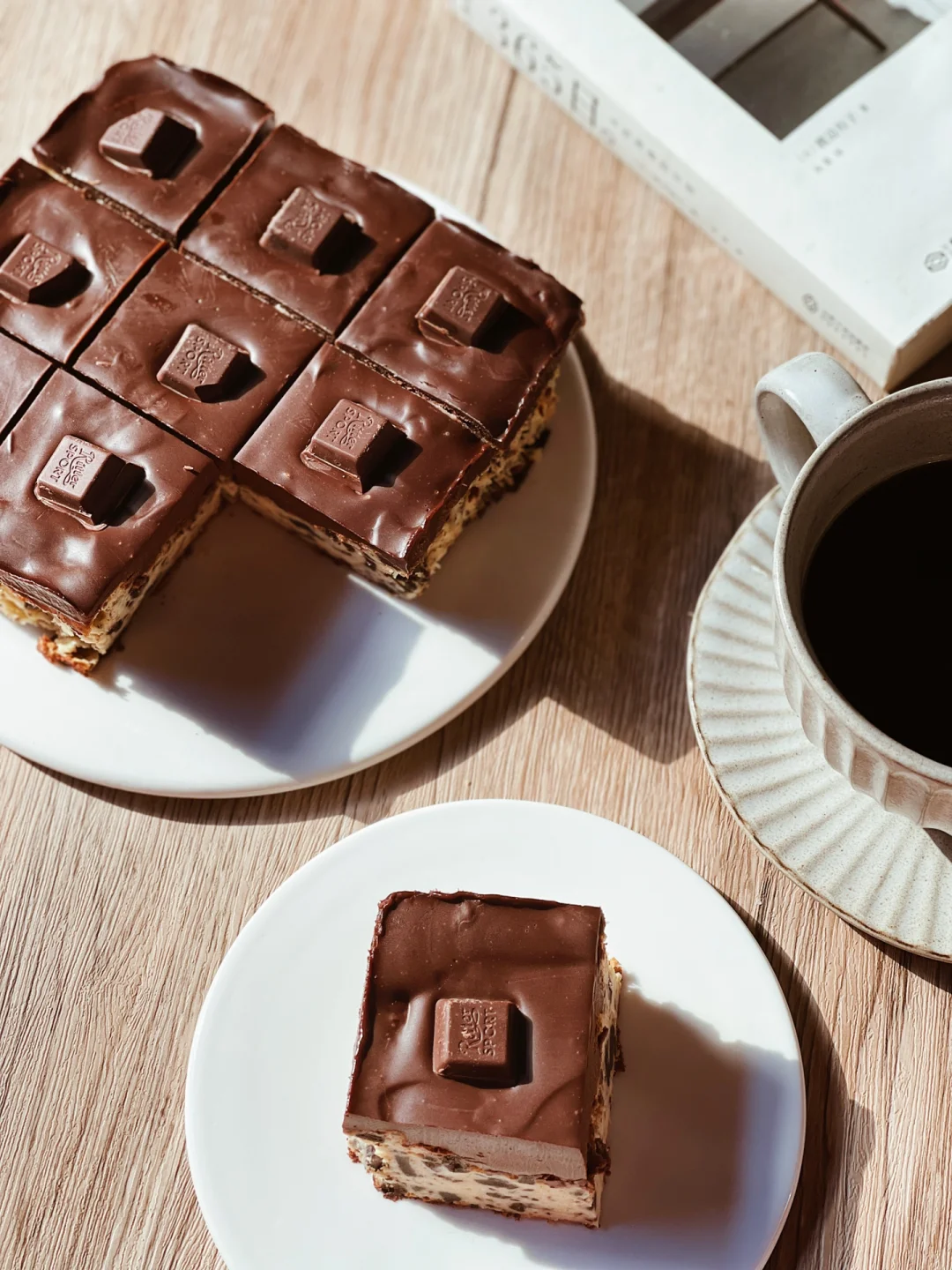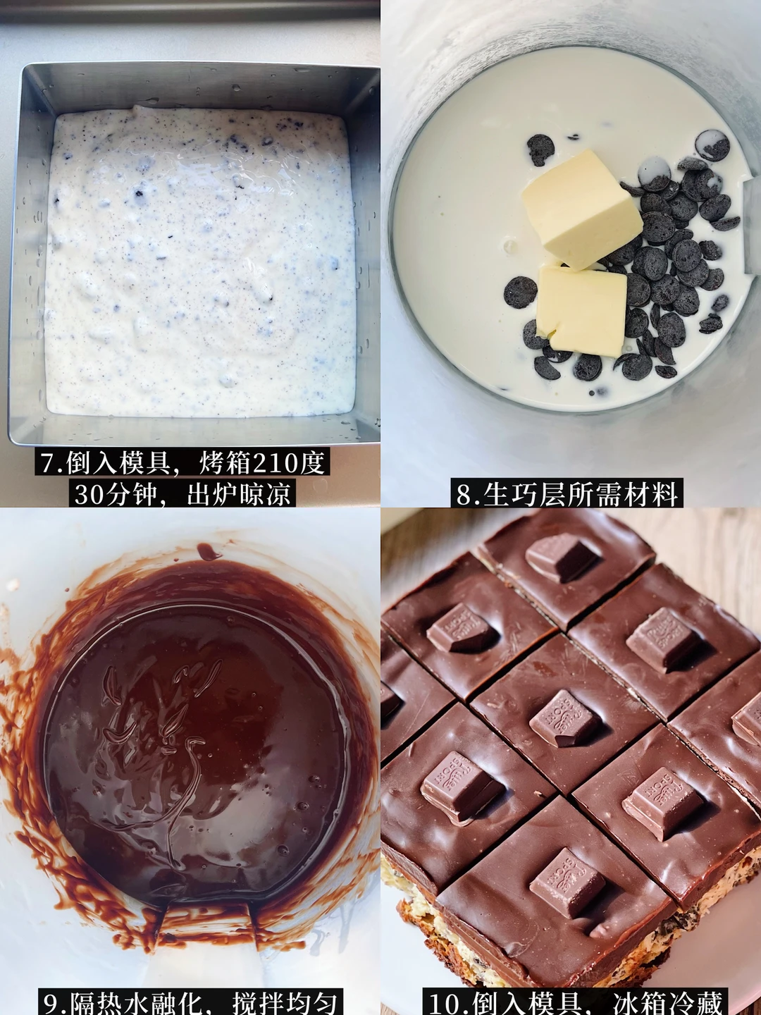 4️⃣生巧层的食材一起隔热水融化,搅拌均匀。倒入模具,冷藏3个小时以上。脱模切块,就可以吃啦~