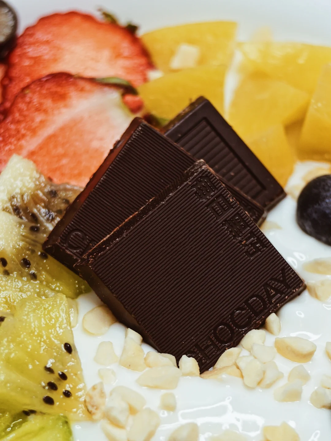 不仅水果和酸奶选择的是低卡低糖的,黑巧克力我选的也是可可固形物含量≥98%,区别于市面上高热量的黑巧克力,它的配料表排在第一的就是可可液块,没有❌添加白砂糖。只用了geng天然的益生元菊粉来增加甜度。简直是控糖女孩的福音啦~~~~