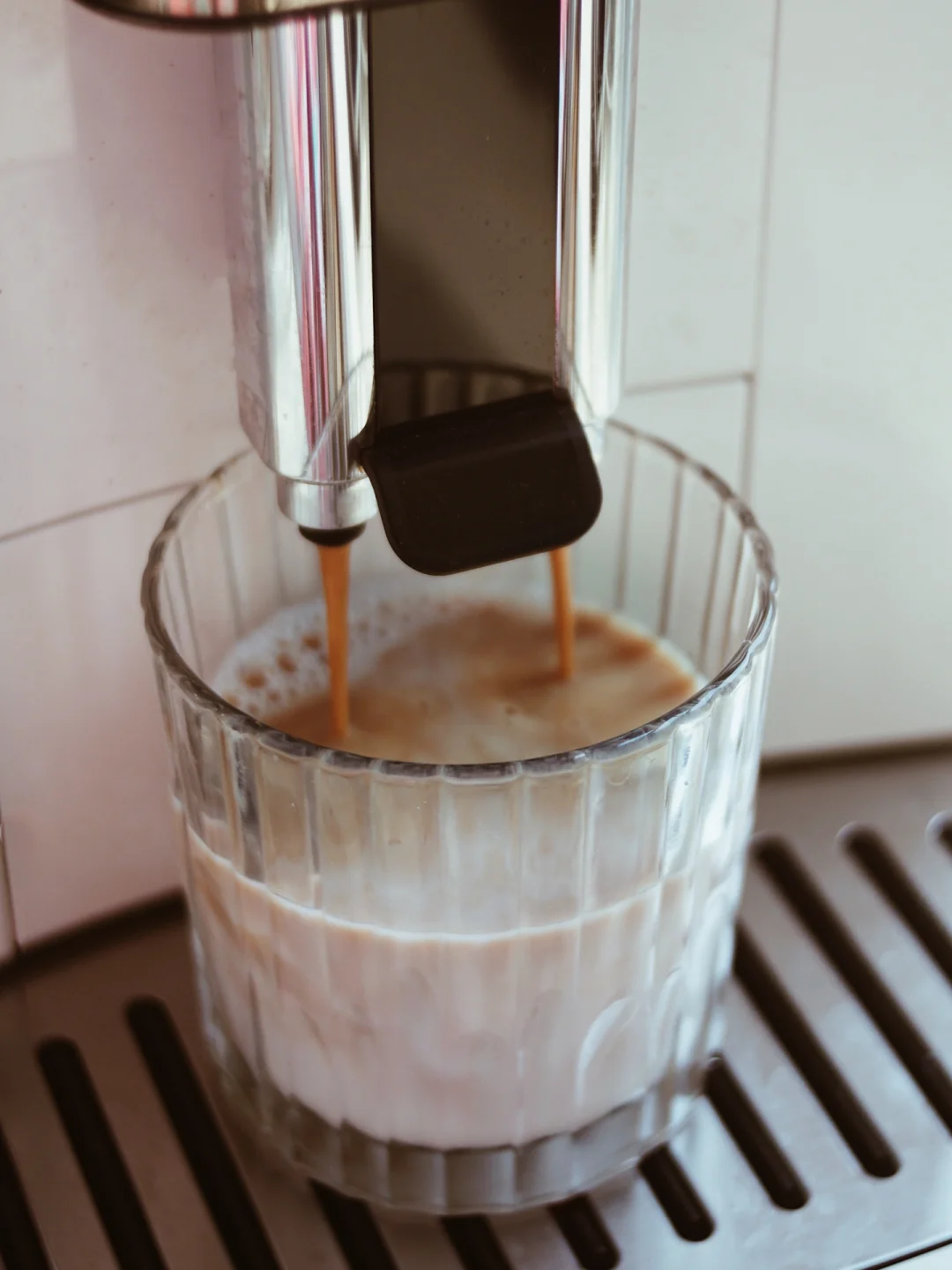 ❸咖啡豆选择深烘豆,咖啡机萃取的时候,可以稍微抬起杯子,让流出的浓缩咖啡液贴近牛奶表面。