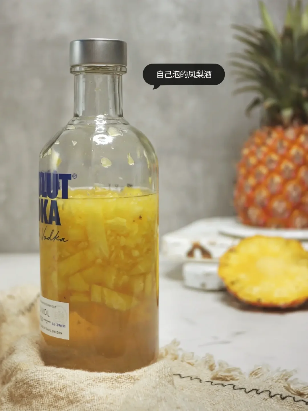 酿制步骤:酒瓶洗净擦干,凤梨去皮切成块,按照一层黄冰糖,一层凤梨的顺序放入瓶中,倒入伏特加。密封保存