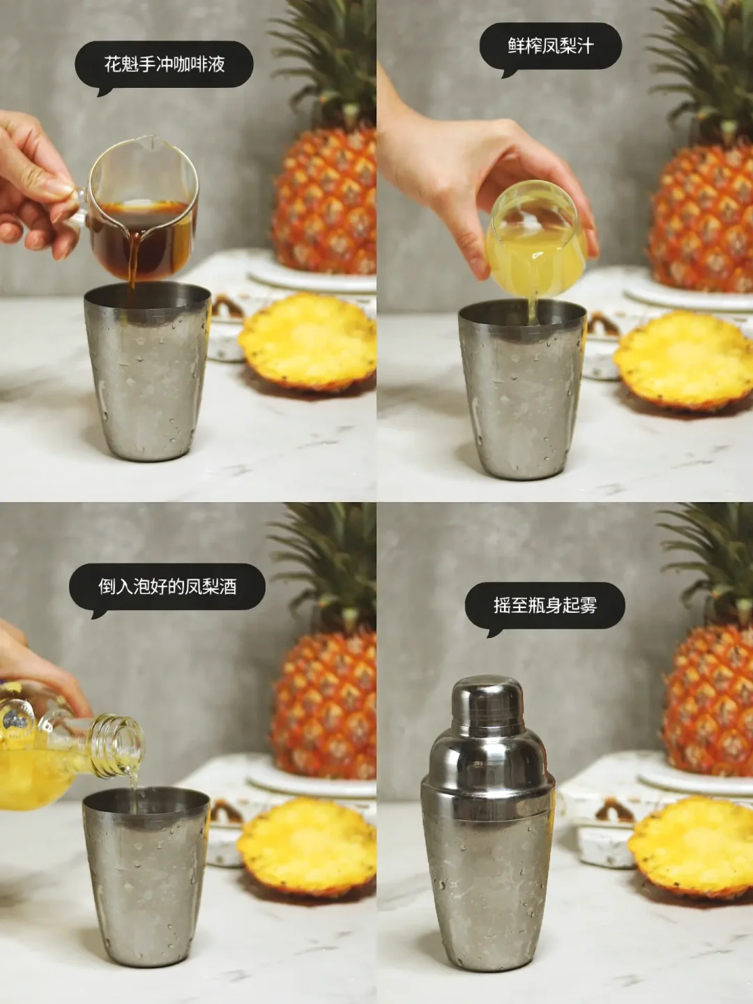 ©️雪克壶里放入适量冰块,依次倒入100ml鲜榨菠萝汁、80ml手冲花魁咖啡液、50ml凤梨酒