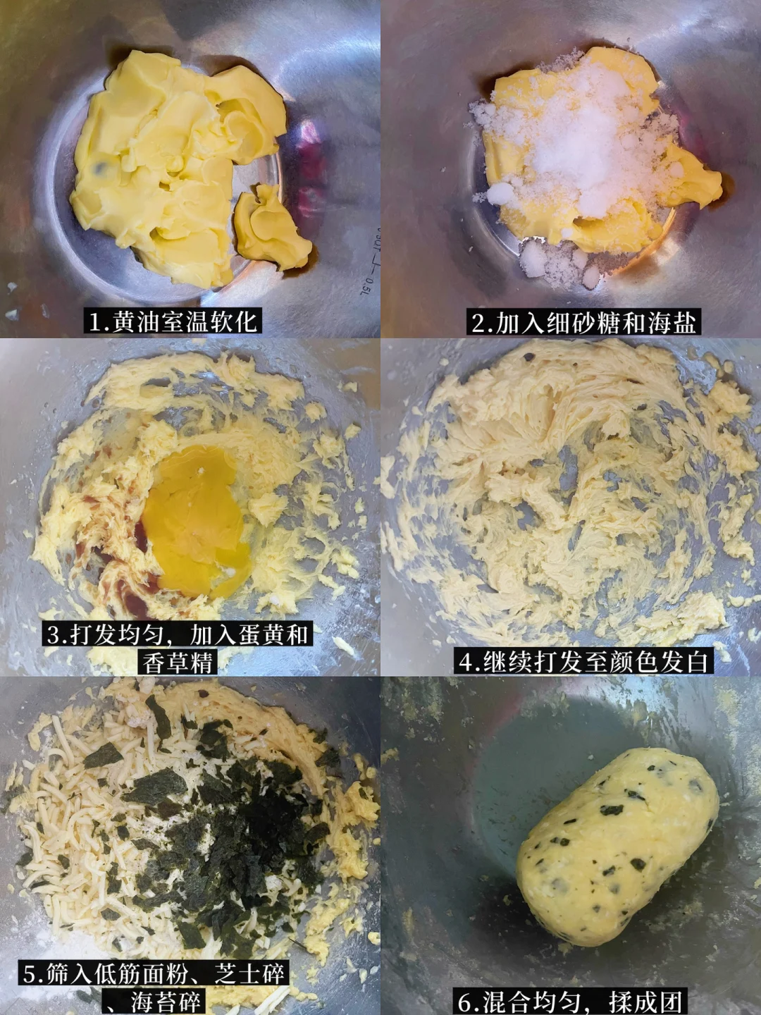 2️⃣加蛋黄和香草精继续搅打至黄油体积变大,蓬松发白的状态,依次筛入低筋面粉和芝士碎、海苔碎,揉捏成面团。
