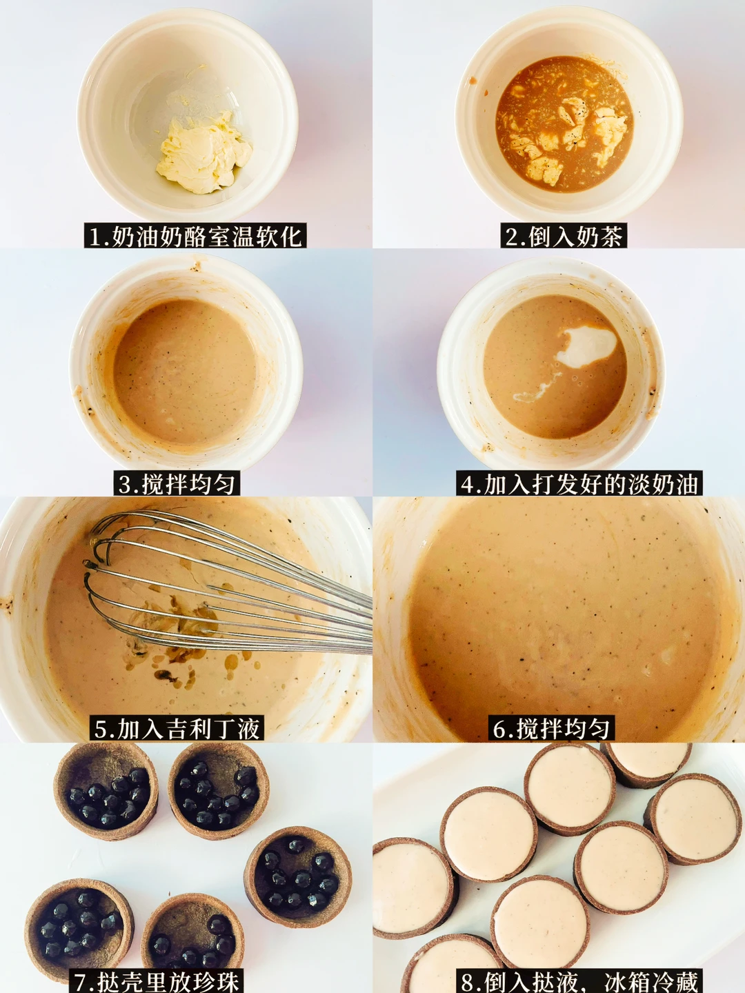 奶油奶酪50g 淡奶油50g 细砂糖15g 红茶2g 牛奶50g 吉利丁片5g 黑糖珍珠40g 可可挞壳10个