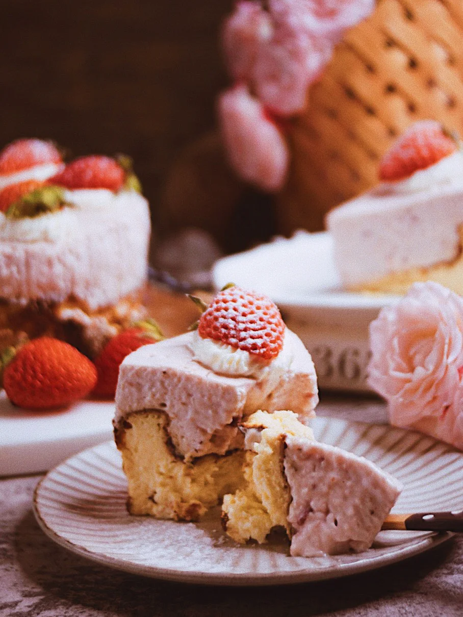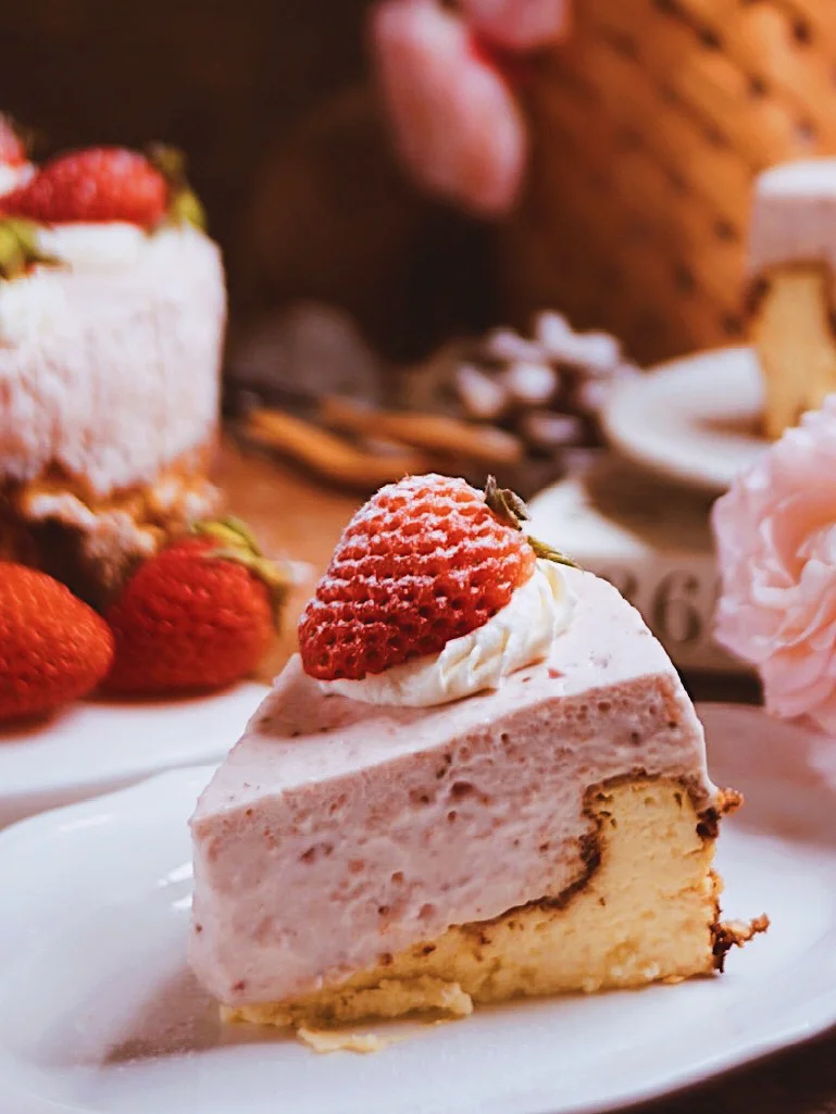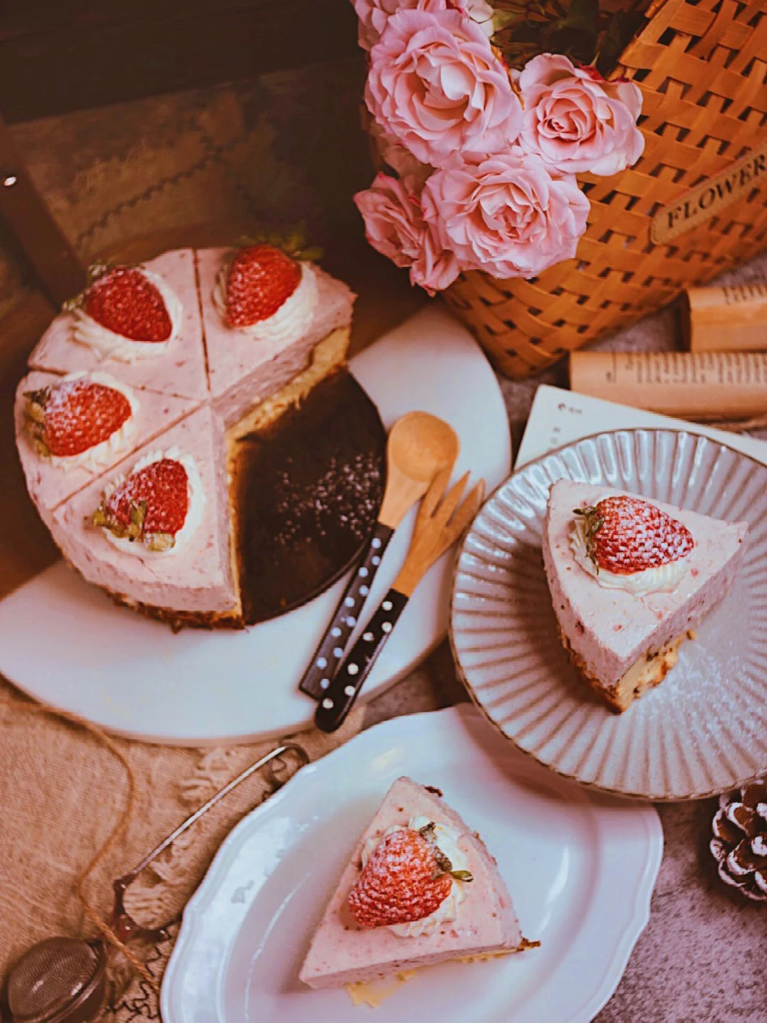 外面飘着雪花❄️给自己做了一份颜值和口感都一绝的草莓巴斯克芝士蛋糕🍰