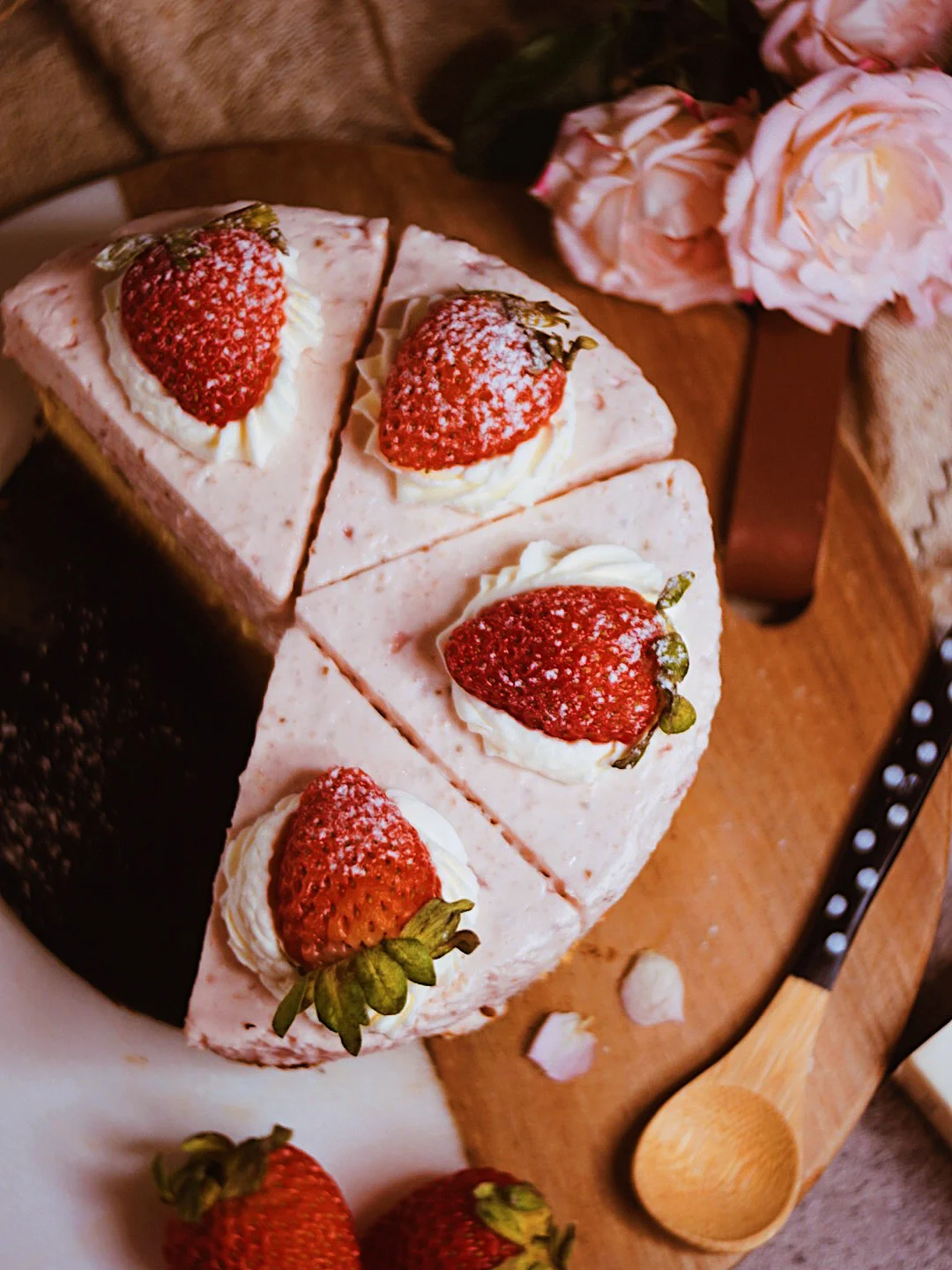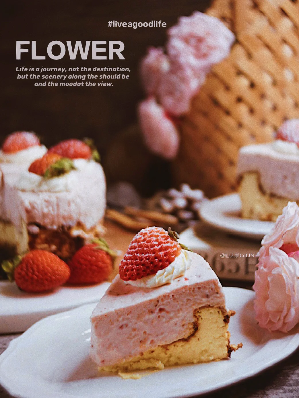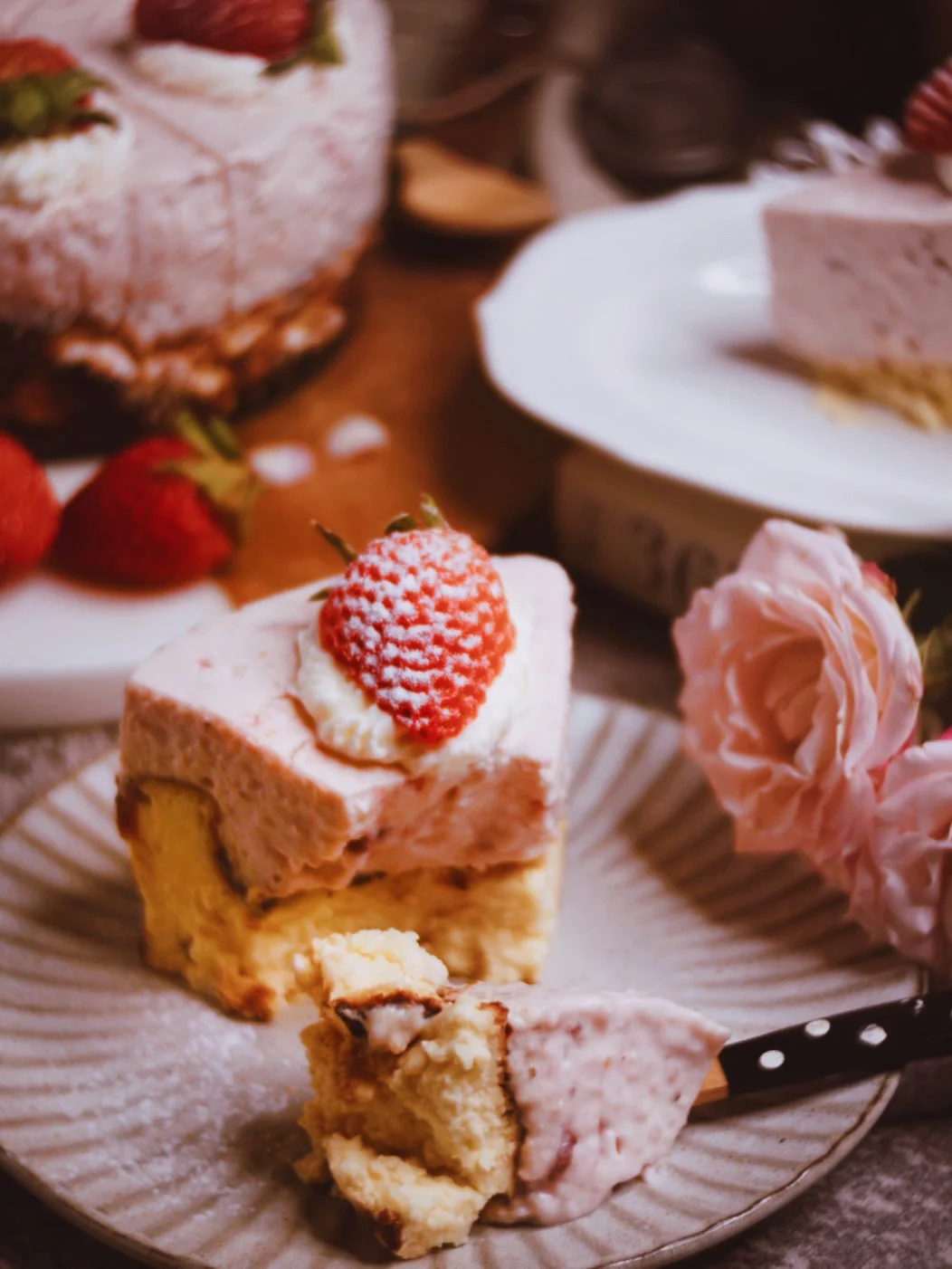 外面飘着雪花❄️给自己做了一份颜值和口感都一绝的草莓巴斯克芝士蛋糕🍰