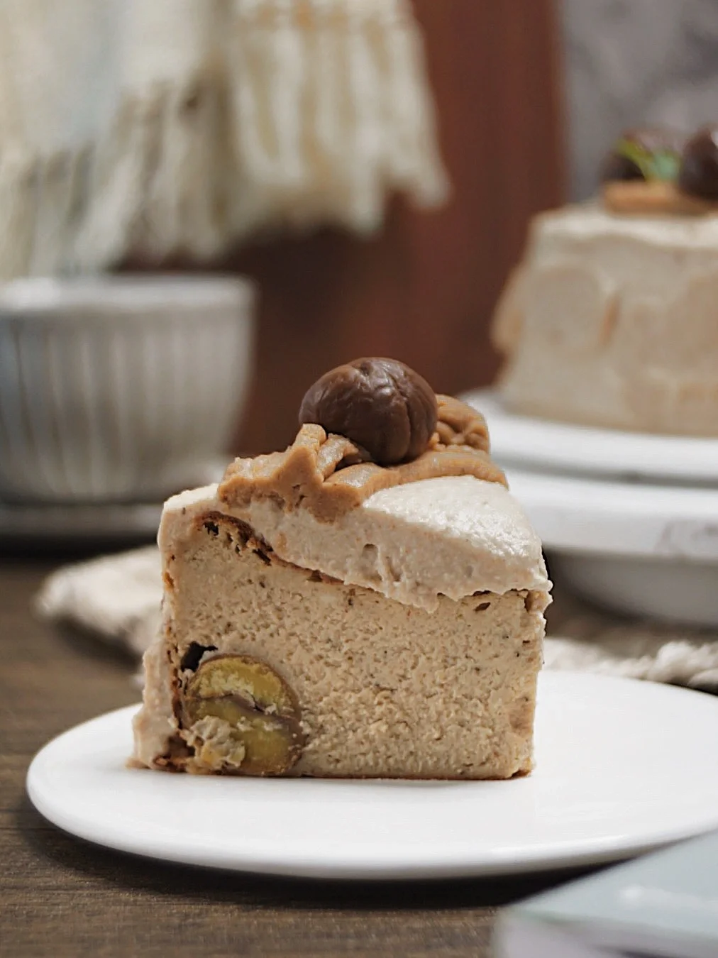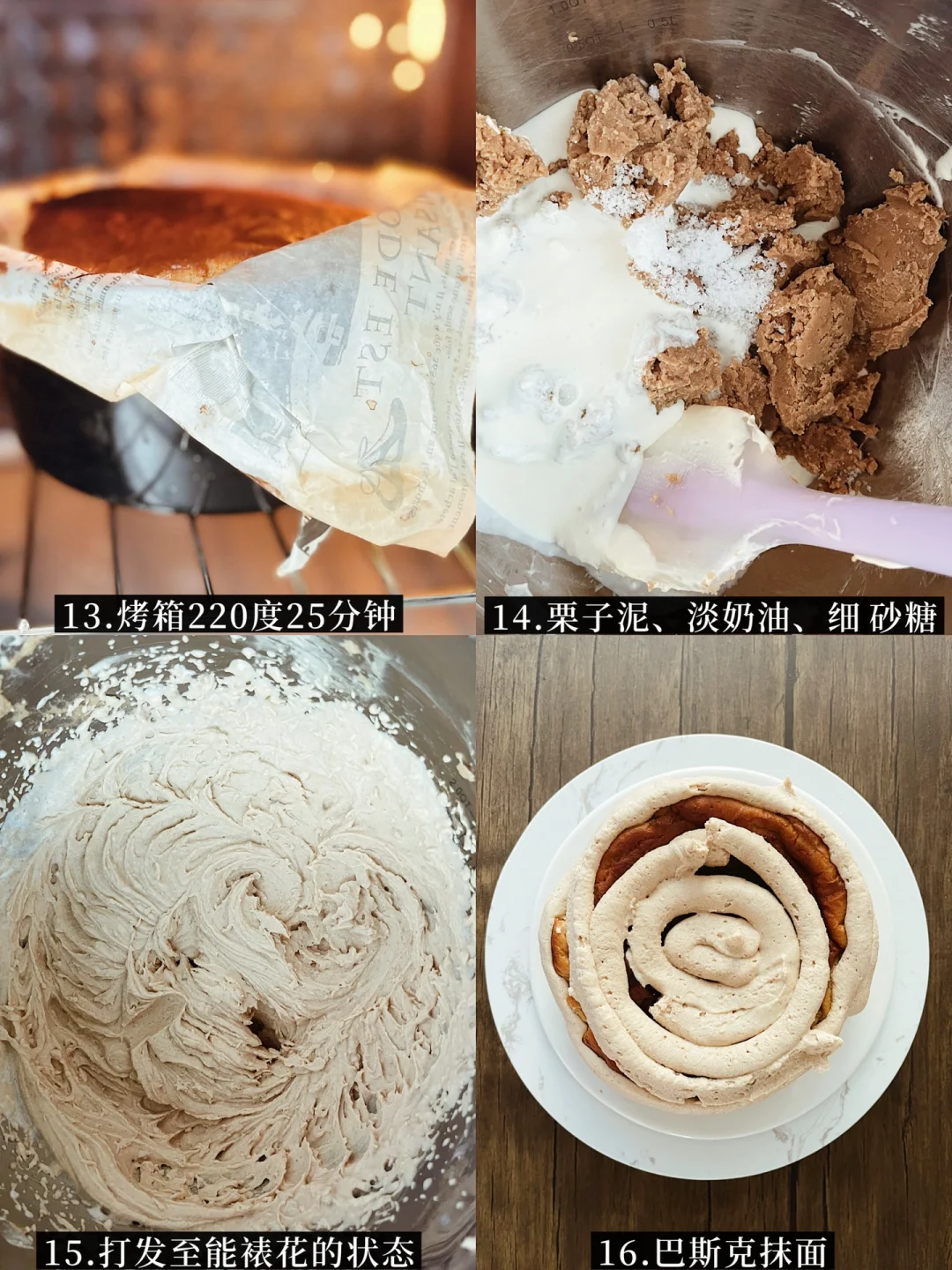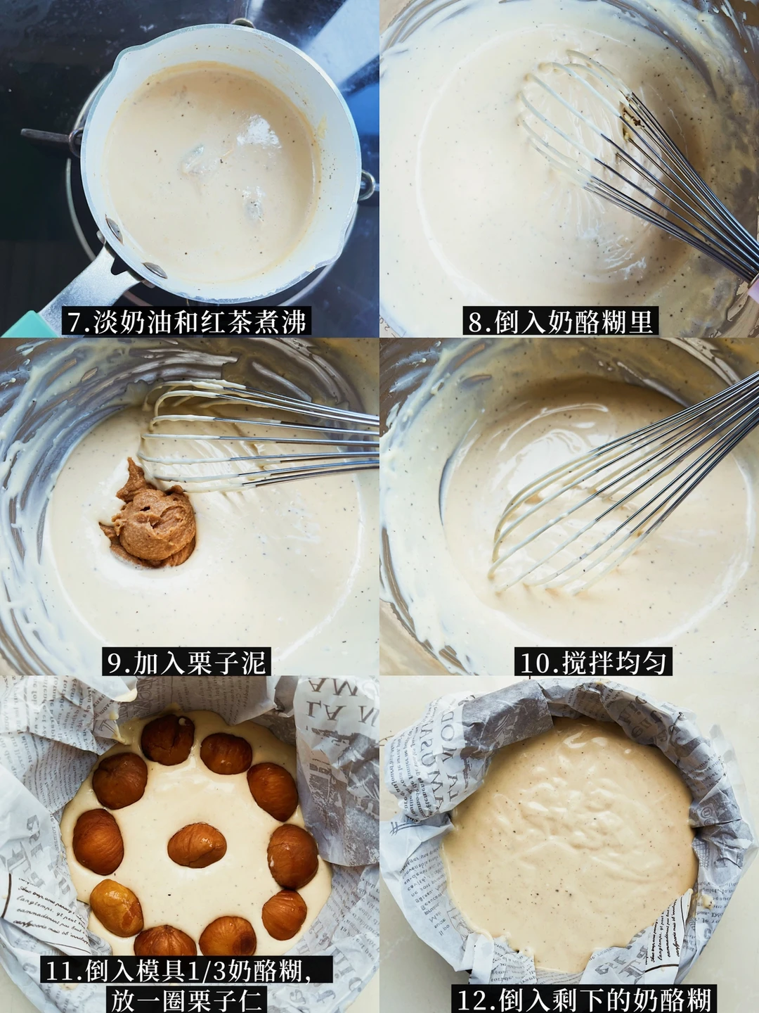 我的烘焙日常 笔记灵感 经常有小伙伴问我,什么甜品适合新手来烘焙啊。在我心里那当然是巴斯克芝士蛋糕啦,只需要搅一搅就能成功 这次的巴斯克芝士蛋糕,用自己熬制的栗子泥、有红茶香气的淡奶油,还有略带微醺酒意的白朗姆酒来丰富层次 · 👩🏻‍🍳【配方:】 ✔️栗子泥: 板栗仁350g 红茶水300g 细砂糖20g 无盐黄油40g ✔️芝士糊: 奶油奶酪240g 细砂糖40g 全蛋2个 玉米淀粉12g 红茶碎2g 淡奶油150g 白朗姆酒15g 香草精2g 栗子泥80g ✔️抹面: 栗子泥100g 淡奶油200g 细砂糖15g ✔️表面装饰: 栗子泥100g 淡奶油50g 栗子仁 薄荷叶 · 👩🏻‍🍳【步骤:】 1️⃣板栗仁与红茶水倒入锅里,大火煮至15分钟左右,倒入料理机搅打顺滑无颗粒的状态。放入黄油和细砂糖开小火翻炒均匀,晾凉备用 2️⃣奶油奶酪与细砂糖一起搅打顺滑无颗粒,分次打入2个鸡蛋搅拌均匀。再依次倒入香草精和白朗姆酒搅拌均匀 3️⃣淡奶油和伯爵红茶倒入奶锅,中火煮沸倒入奶酪糊里,与80g栗子泥搅拌均匀,筛入玉米淀粉翻拌 4️⃣倒入1/3的奶酪糊到模具中,码上熟栗子,再倒入其余的奶酪糊,入烤箱220度25分钟。冷却后脱模 5️⃣栗子泥、淡奶油与细砂糖用电动打蛋器打发至能裱花的状态,对巴斯克蛋糕进行抹面 6️⃣栗子泥与淡奶油搅拌均匀顺滑,装入裱花袋,挤圈圈,放板栗仁和薄荷叶装饰,切块食用