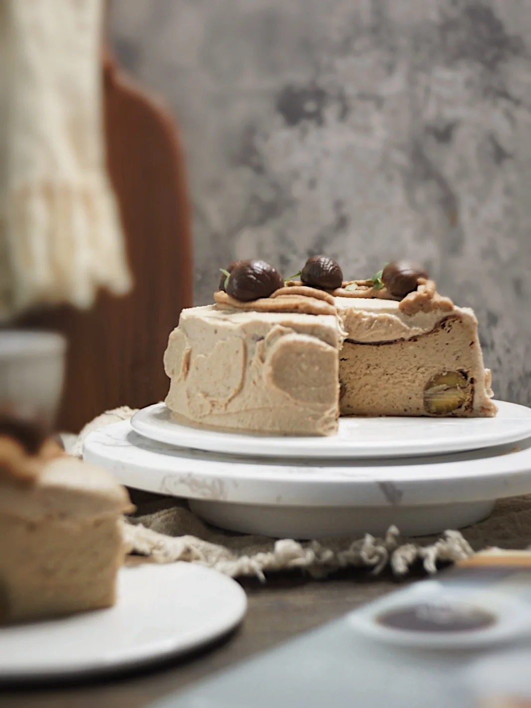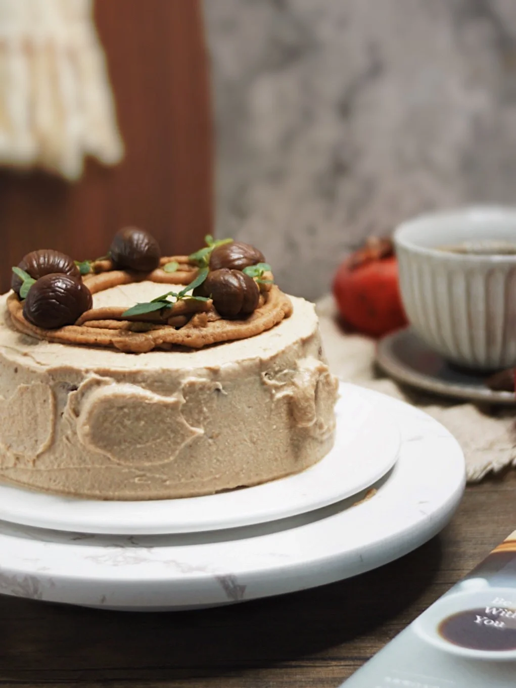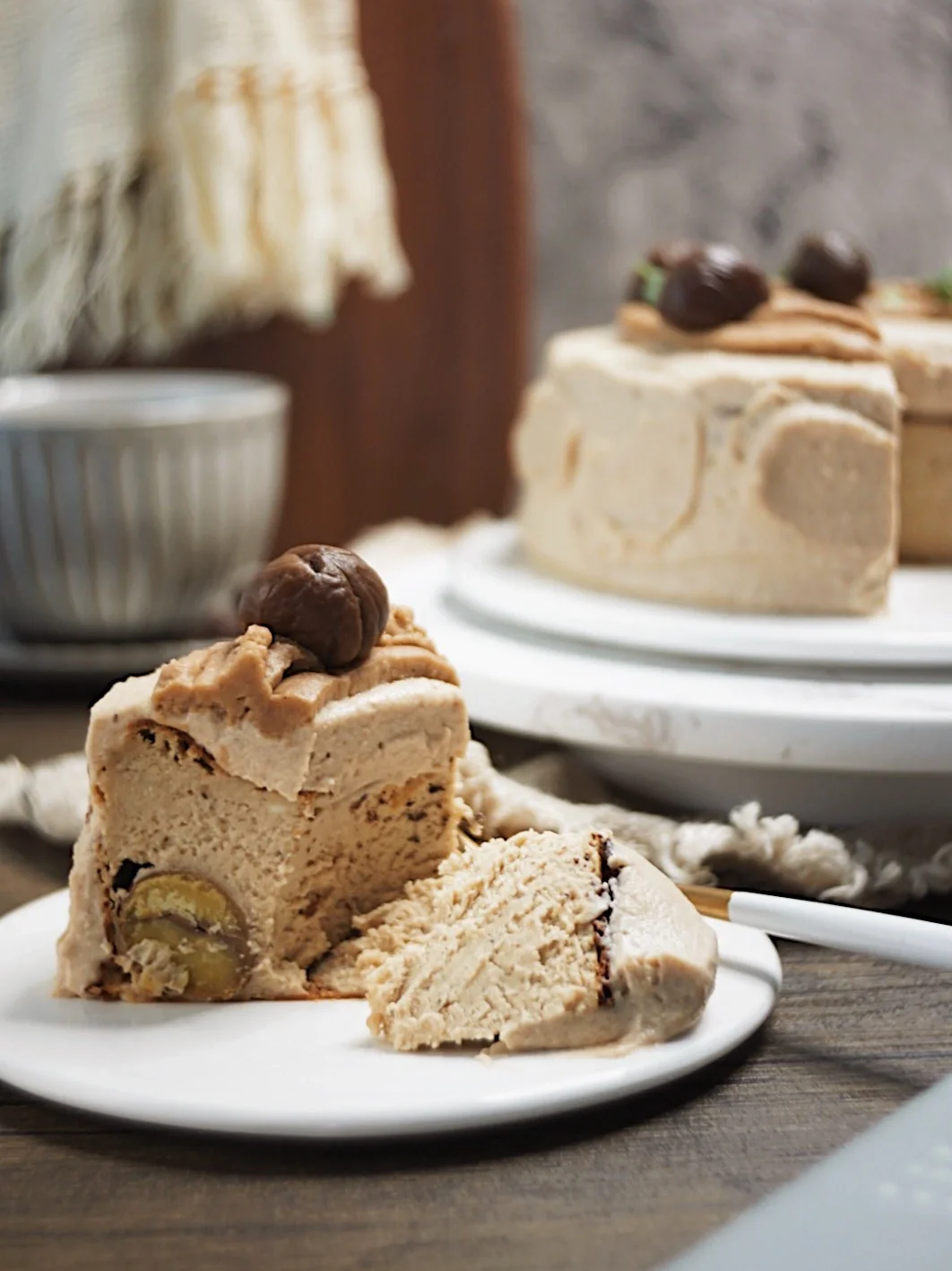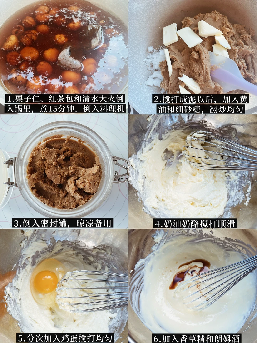 我的烘焙日常 笔记灵感 经常有小伙伴问我,什么甜品适合新手来烘焙啊。在我心里那当然是巴斯克芝士蛋糕啦,只需要搅一搅就能成功 这次的巴斯克芝士蛋糕,用自己熬制的栗子泥、有红茶香气的淡奶油,还有略带微醺酒意的白朗姆酒来丰富层次 · 👩🏻‍🍳【配方:】 ✔️栗子泥: 板栗仁350g 红茶水300g 细砂糖20g 无盐黄油40g ✔️芝士糊: 奶油奶酪240g 细砂糖40g 全蛋2个 玉米淀粉12g 红茶碎2g 淡奶油150g 白朗姆酒15g 香草精2g 栗子泥80g ✔️抹面: 栗子泥100g 淡奶油200g 细砂糖15g ✔️表面装饰: 栗子泥100g 淡奶油50g 栗子仁 薄荷叶 · 👩🏻‍🍳【步骤:】 1️⃣板栗仁与红茶水倒入锅里,大火煮至15分钟左右,倒入料理机搅打顺滑无颗粒的状态。放入黄油和细砂糖开小火翻炒均匀,晾凉备用 2️⃣奶油奶酪与细砂糖一起搅打顺滑无颗粒,分次打入2个鸡蛋搅拌均匀。再依次倒入香草精和白朗姆酒搅拌均匀 3️⃣淡奶油和伯爵红茶倒入奶锅,中火煮沸倒入奶酪糊里,与80g栗子泥搅拌均匀,筛入玉米淀粉翻拌 4️⃣倒入1/3的奶酪糊到模具中,码上熟栗子,再倒入其余的奶酪糊,入烤箱220度25分钟。冷却后脱模 5️⃣栗子泥、淡奶油与细砂糖用电动打蛋器打发至能裱花的状态,对巴斯克蛋糕进行抹面 6️⃣栗子泥与淡奶油搅拌均匀顺滑,装入裱花袋,挤圈圈,放板栗仁和薄荷叶装饰,切块食用