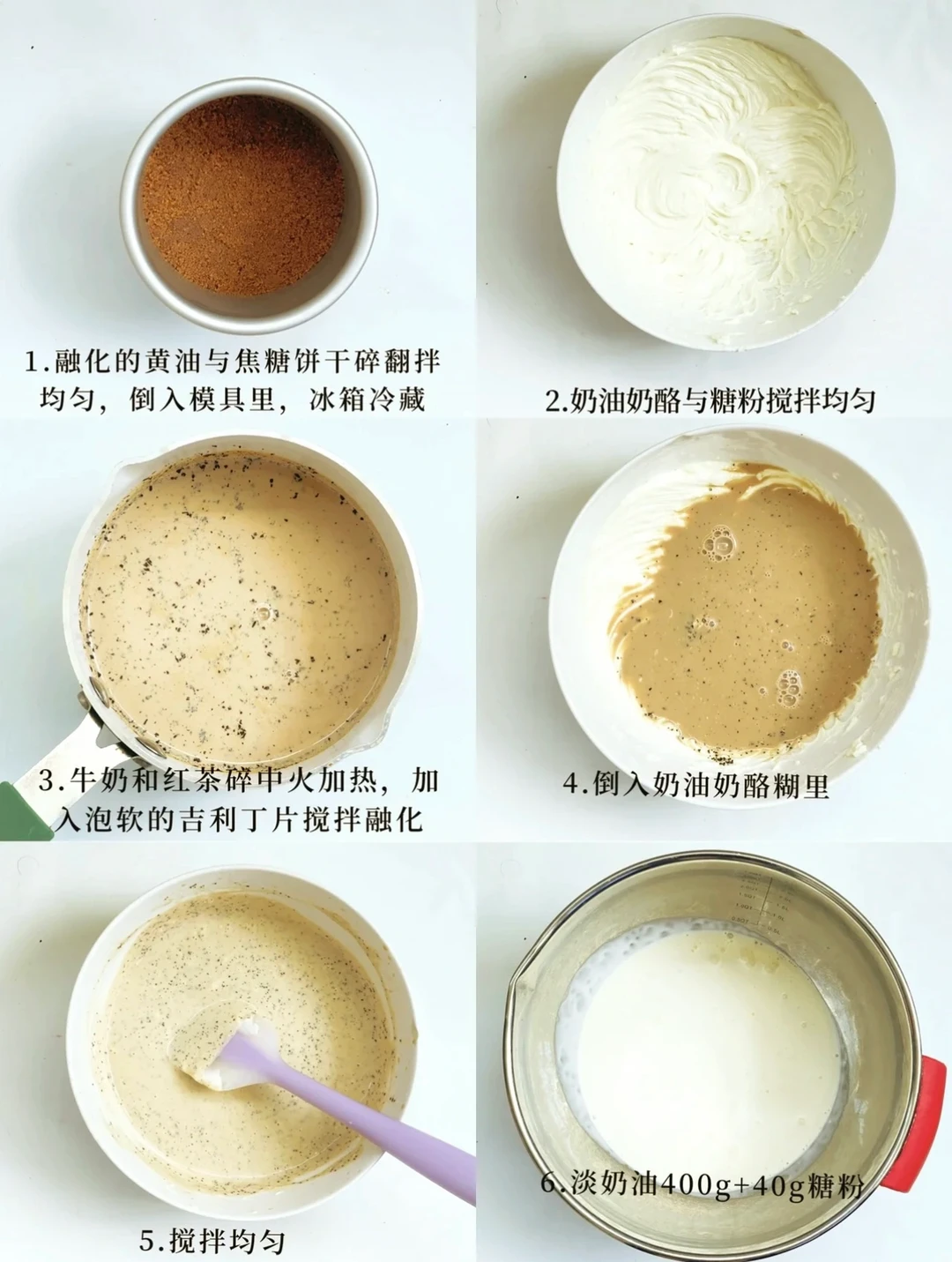 奶油奶酪240g 淡奶油400g 牛奶80g 细砂糖70g 吉利丁片15g 红茶碎6g