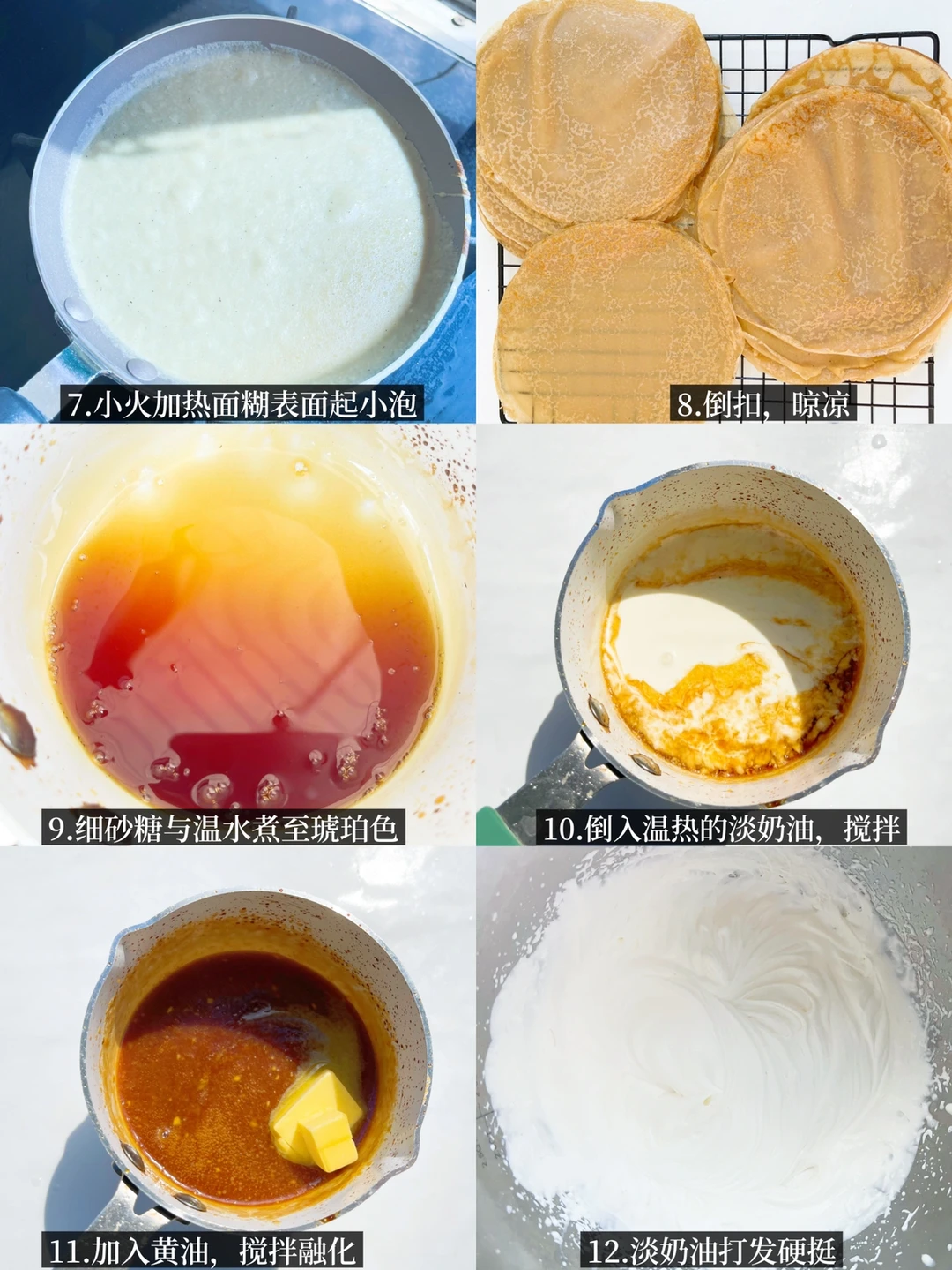 ▪️煎饼皮的时候全程小火,煎好一张饼皮以后,千层锅可以放在湿毛巾上降温,在继续煎下一张。避免饼皮底部煎糊