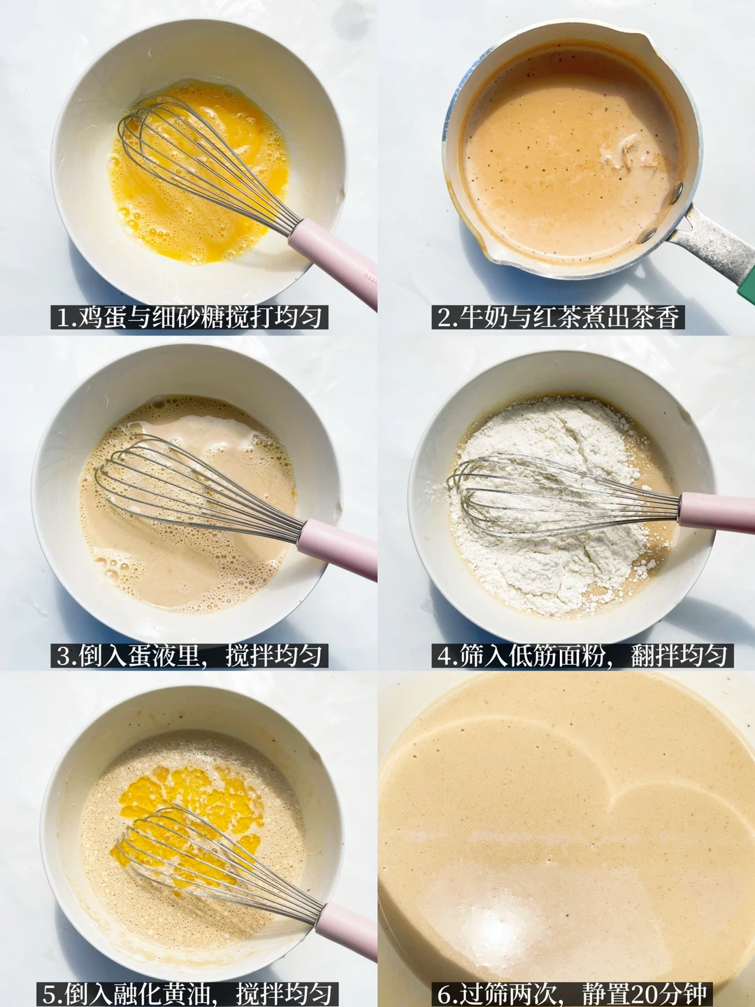 饼皮:鸡蛋3个 牛奶280g 细砂糖40g 低筋面粉150g 黄油25g 伯爵红茶茶包1袋