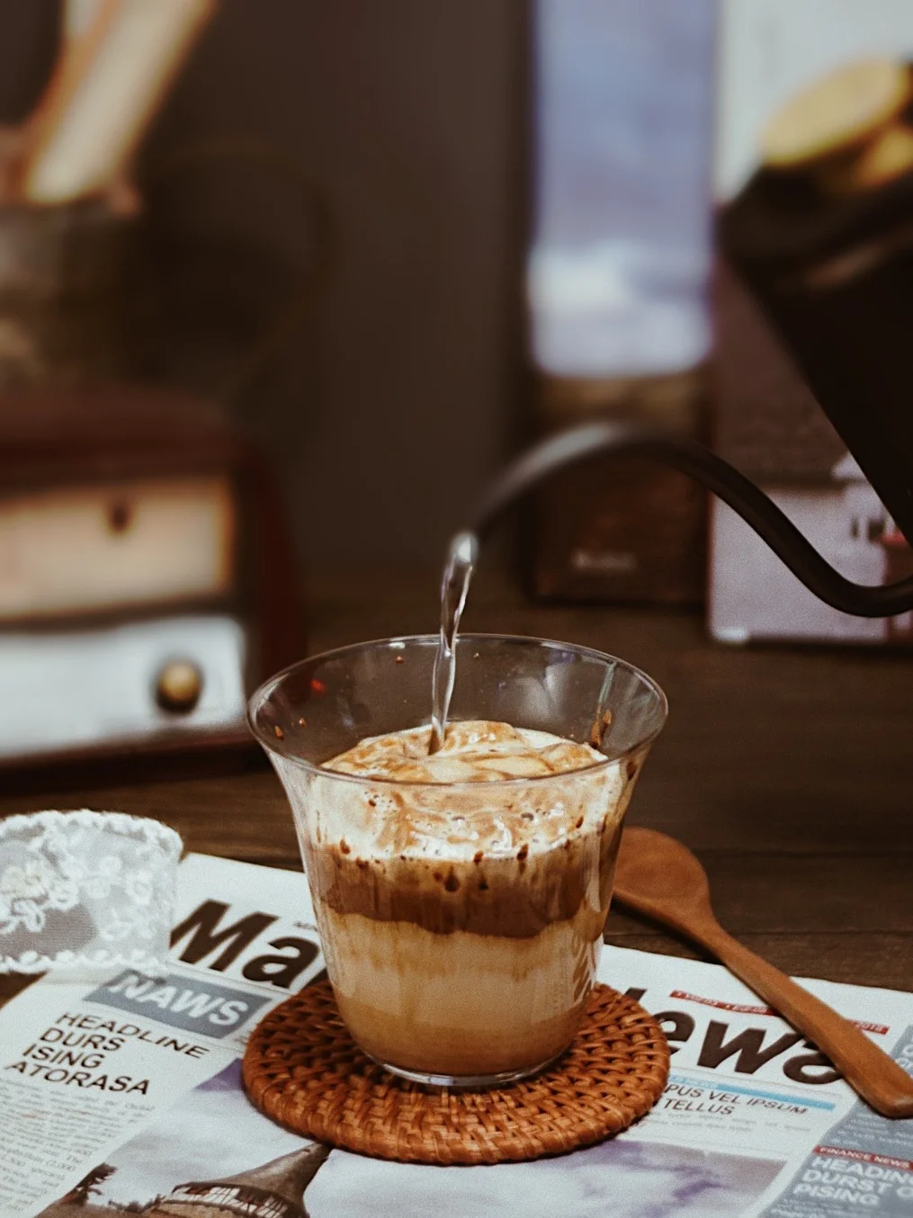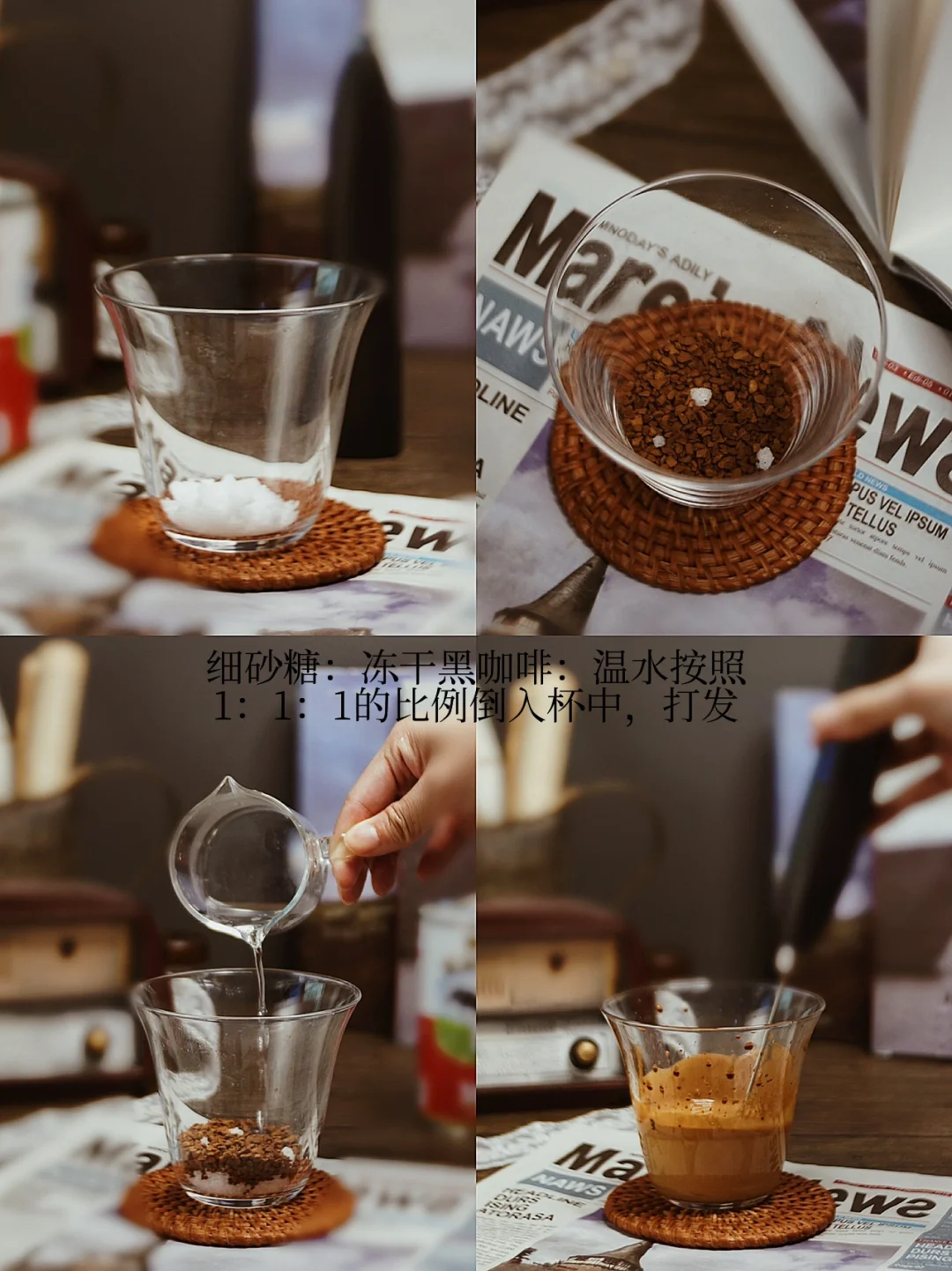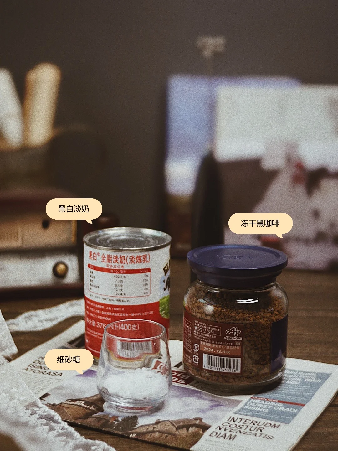 笔记灵感 澳门咖啡 我的咖啡日记 咖啡 咖啡推荐 自制咖啡 自制神仙饮品 好喝的饮品 自制饮品 𝐜𝐨𝐟𝐟𝐞𝐞 𝐭𝐢𝐦𝐞|热乎乎,浓郁奶香的澳门咖啡🇲🇴绵密厚重的泡沫,像流沙一样🌊与4000次手打咖啡不同,牛奶换成了黑白淡奶,唇齿回甘绵延悠长。 ☕【原材料准备:】 黑白淡奶100ml 冻干黑咖啡7g 细砂糖7g 温水7g 热开水适量 · ☕【做法:】 ❶冻干黑咖啡、细砂糖、温水按照1:1:1的比例倒入杯中,用打蛋器打发至倒杯不倒,不流动的状态 ❷从中心点倒入黑白淡奶,再倒入热开水