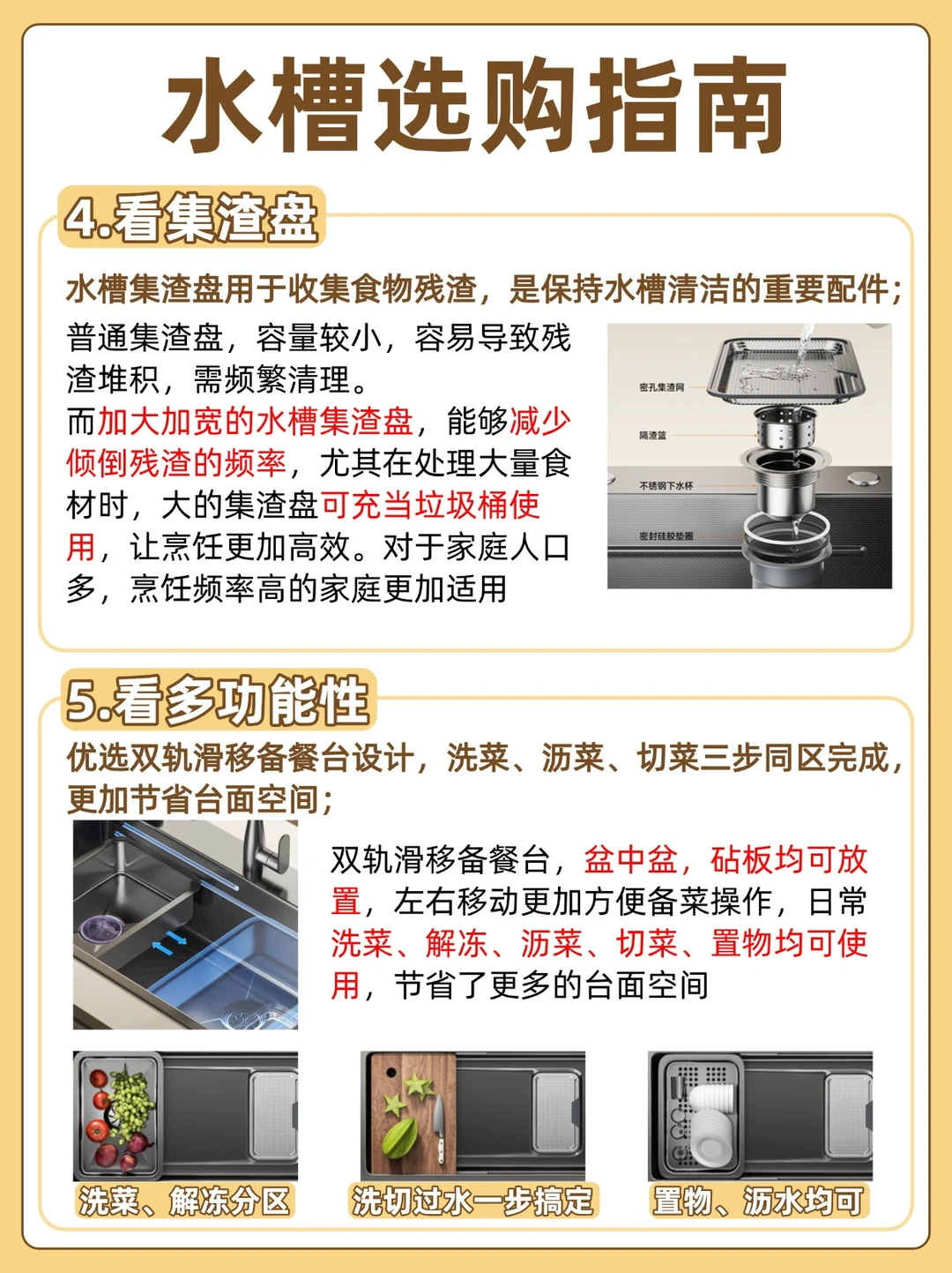 优选加大加宽的水槽集渣盘,能够减少倾倒残渣的频率,尤其在处理大量食材时,大的集渣盘可充当垃圾桶使用,让烹饪更加高效