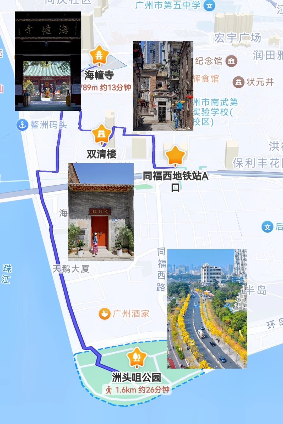 同福西路A出口➠ 骑楼街➠ 双清楼➠ 栖栅南街➠ 海幢寺➠ 洲头咀公园