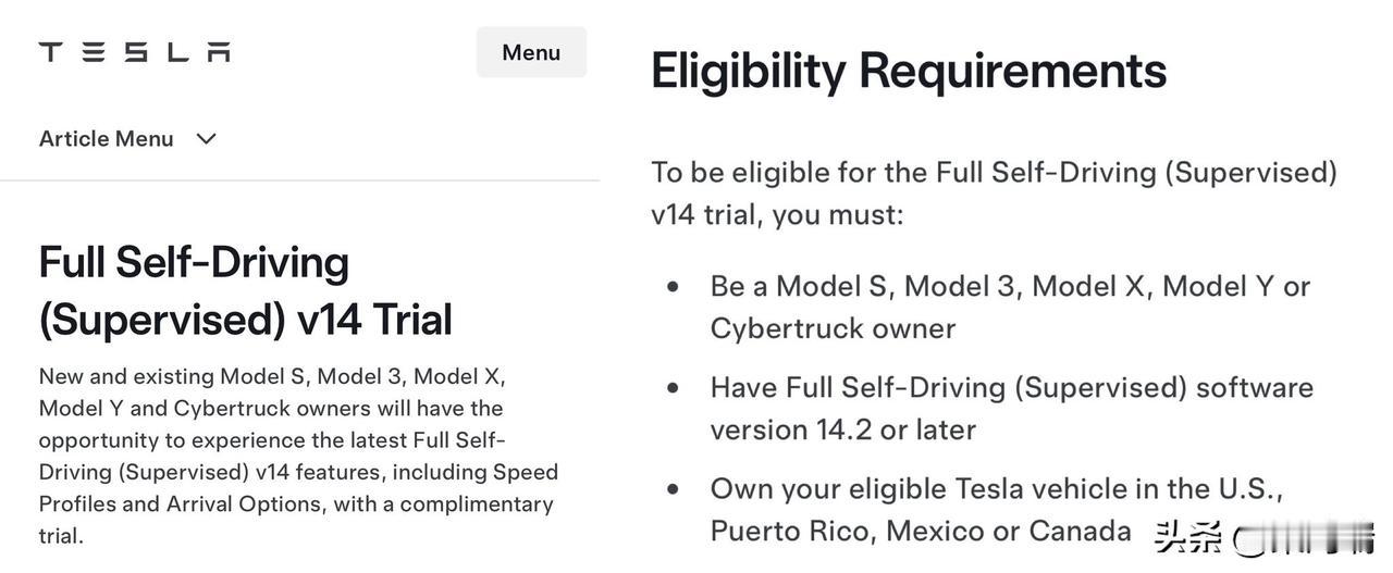 突发新闻:从今晚开始,特斯拉将在北美地区(美国,加拿大,墨西哥,波多黎各)为约 150 万拥有 HW4 硬件但尚未购买 FSD 的特斯拉车主推出 FSD(监督式)V14 的 30 天免费试用! 车主将收到关于此次试用活动的电子邮件和应用内通知。特斯拉车队使用 FSD 功能行驶的总累计里程即将大幅增长! 正好赶上感恩节,圣诞节假期以及新年,这将是一次超大规模的Tesla用户体验FSD的机会,包含车上非特斯拉车主的体验,这会非常震撼的。 FSD(Full Self-Driving)是特斯拉研发的一套自动驾驶系统,目标是实现车辆在没有人干预的情况下自主识别路况、规划路线、控制速度和方向,完成从起点到终点的行驶。FSD系统包括自动紧急刹车(AEB)、自动变道和交通导航等功能,并能在城市街道进行半自主导航以及对交通灯或停车标志做出反应。 主要功能 FSD 系统建立在特斯拉基础的 Autopilot(自动辅助驾驶)功能之上,增加了更高级的城市和复杂场景驾驶能力。主要功能包括: 1、在城市街道上自动辅助转向:能够在城市环境中导航和驾驶。 2、交通信号灯和停车标志控制:能够识别并对交通信号灯和停车标志做出反应,并在需要时停车或继续行驶。 3、自动变道:在高速公路和城市道路上,开启转向灯后,车辆可以自主判断并安全变道。 4、自动泊车:自动寻找停车位并完成平行或垂直泊车。 5、召唤:在狭窄空间内,使用手机应用程序远程移动车辆进出停车位。 6、自动辅助导航驾驶 (NOA):在高速公路上自动驶入和驶出匝道,并超越慢速行驶的车辆。 特斯拉已在中国市场推出了FSD功能,目前售价为6.4万元人民币。中国版的FSD目前主要聚焦于城市道路的自动辅助驾驶优化,功能上与美国等地的最新版本(如FSD Beta v12)存在一定差异,但随着数据合规化和技术迭代,功能正在逐步完善。
